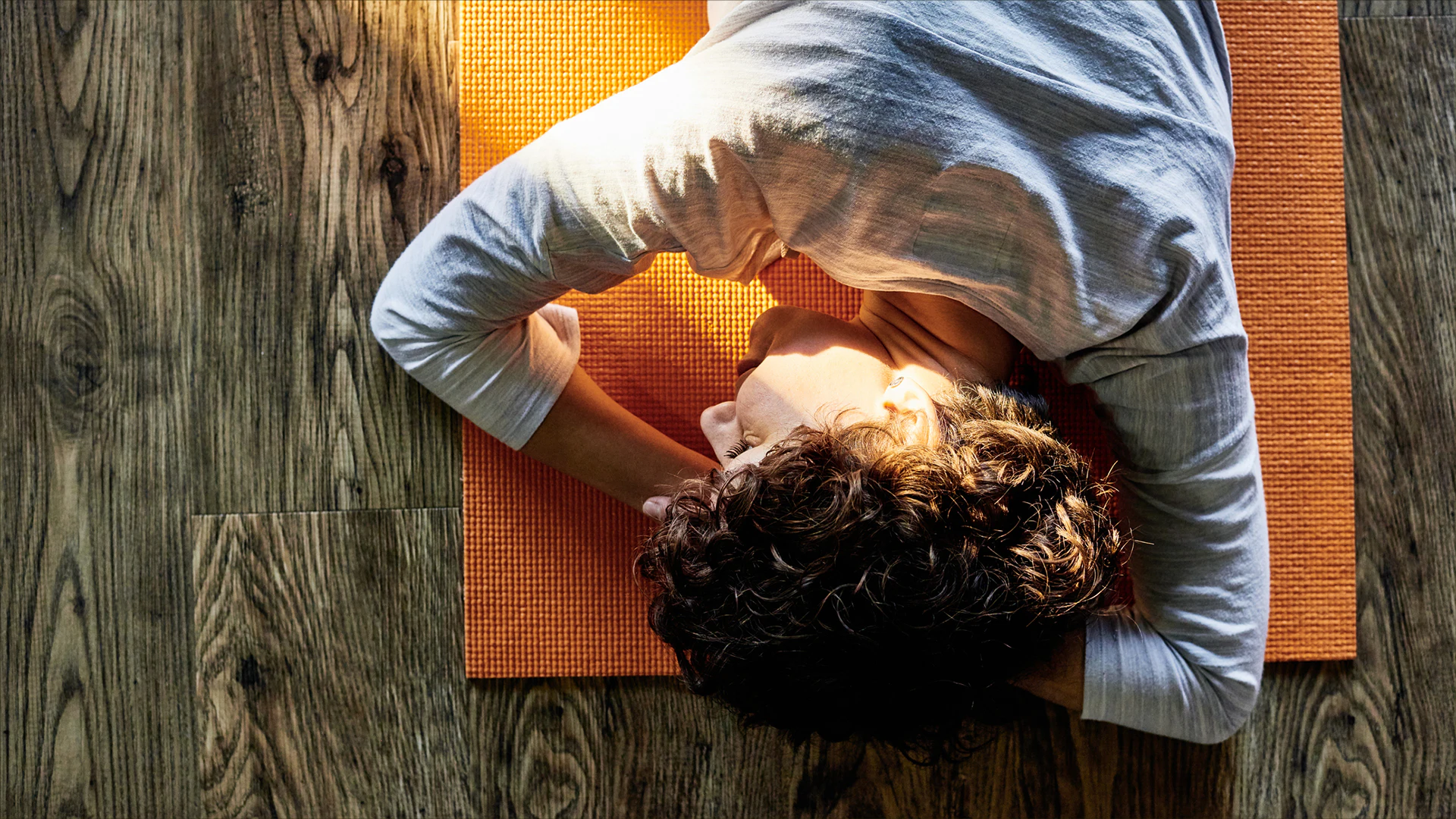 First set up your props. You'll want a bolster or blanket roll under your knees and a blanket or cushion to support your head. Place a blanket on your mat, or use a carpeted floor. (You can also do this in or on your bed, if you wish; I often have. You may also enjoy having an extra blanket as a cover.)