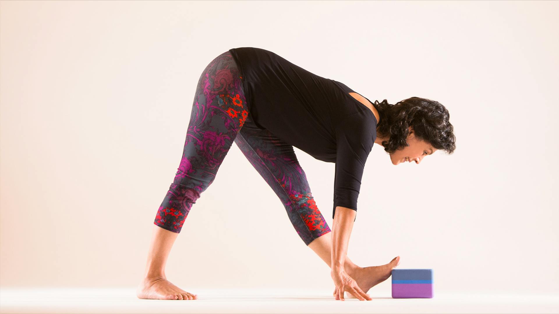 In poses such as pyramid (parsvottanasana) and half splits (ardha hanumanasana), flex your front foot, pulling your toes toward your shin. Propping the ball of your front foot up on a block (keeping the heel on the floor) can help intensify the calf stretch by adding resistance to the foot flexion.