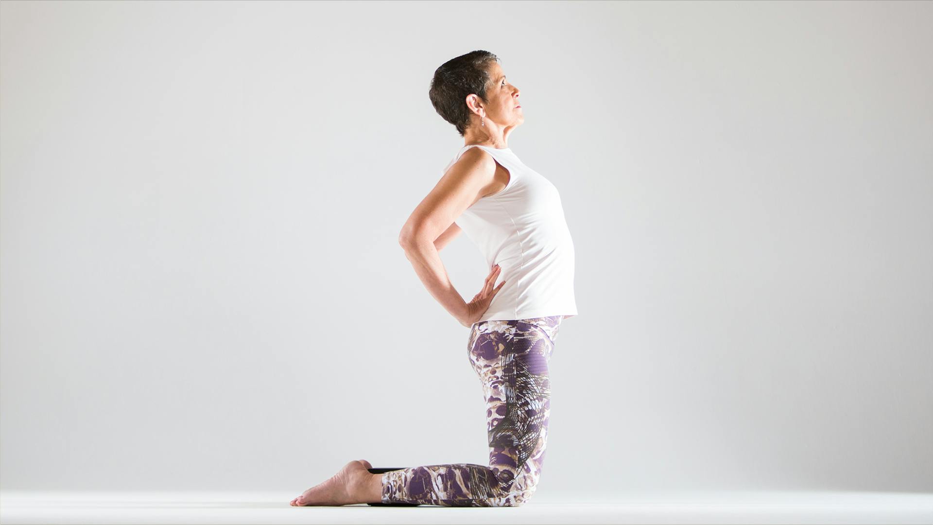 2. Camel Pose (with hands on lower back) This high version of camel pose is a mild backbend that gently encourages an inward curve of the thoracic spine, important for those with osteoporosis whose upper backs are beginning to round.