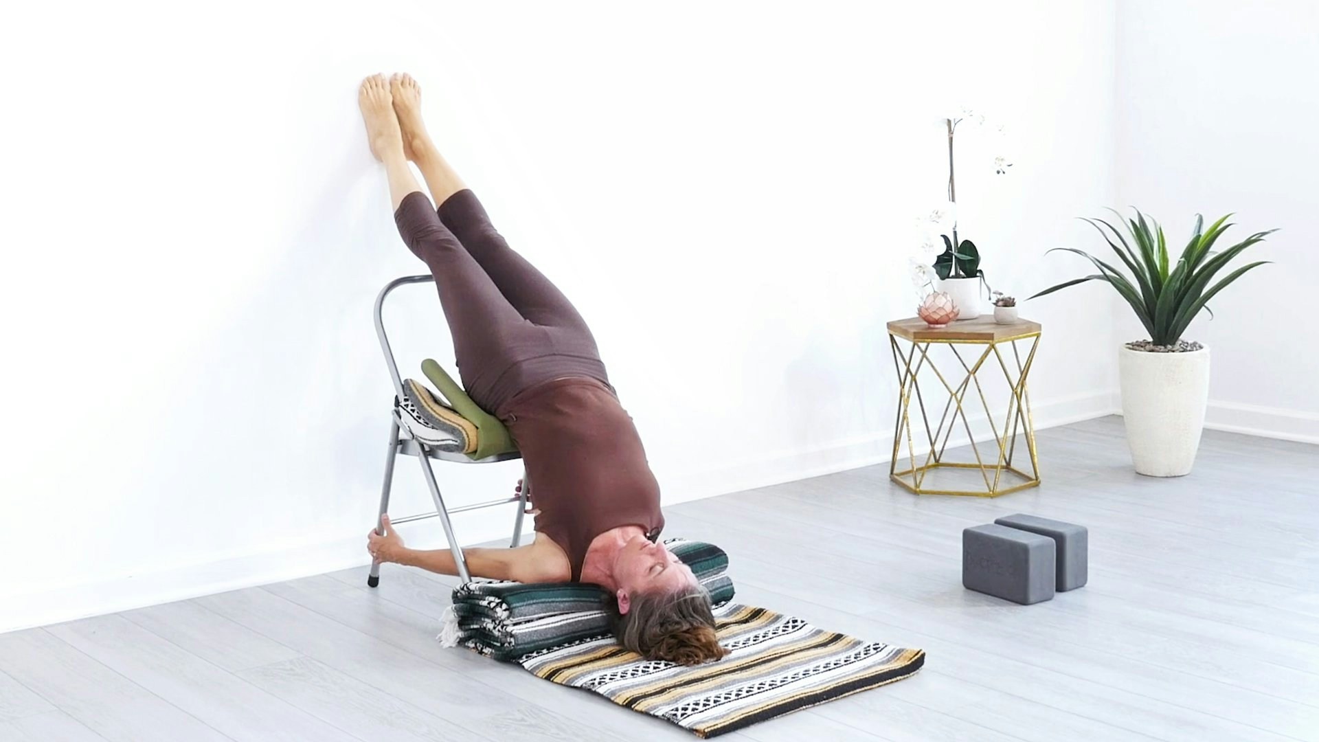 In the second part of the class, you’ll do a chair- and wall-supported backbend and a chair- and blanket-supported sarvangasana (shoulderstand) before concluding with two savasanas. The first savasana supports your head and back with lots of blankets and the second one uses less.