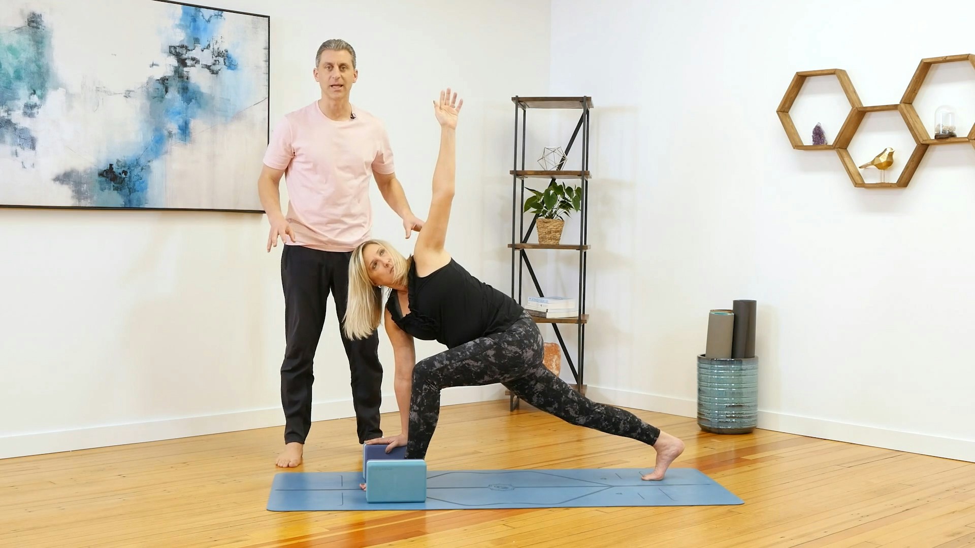 You’ll begin lying down for a breathing practice followed by feel-good stretches. After that, you’ll come to all fours for child’s pose, cat-cow, thread the needle pose, and spinal balance. You’ll then make your way onto your feet for lunge, pyramid, revolved lunge, and more while placing special focus on your personal power and your breath.