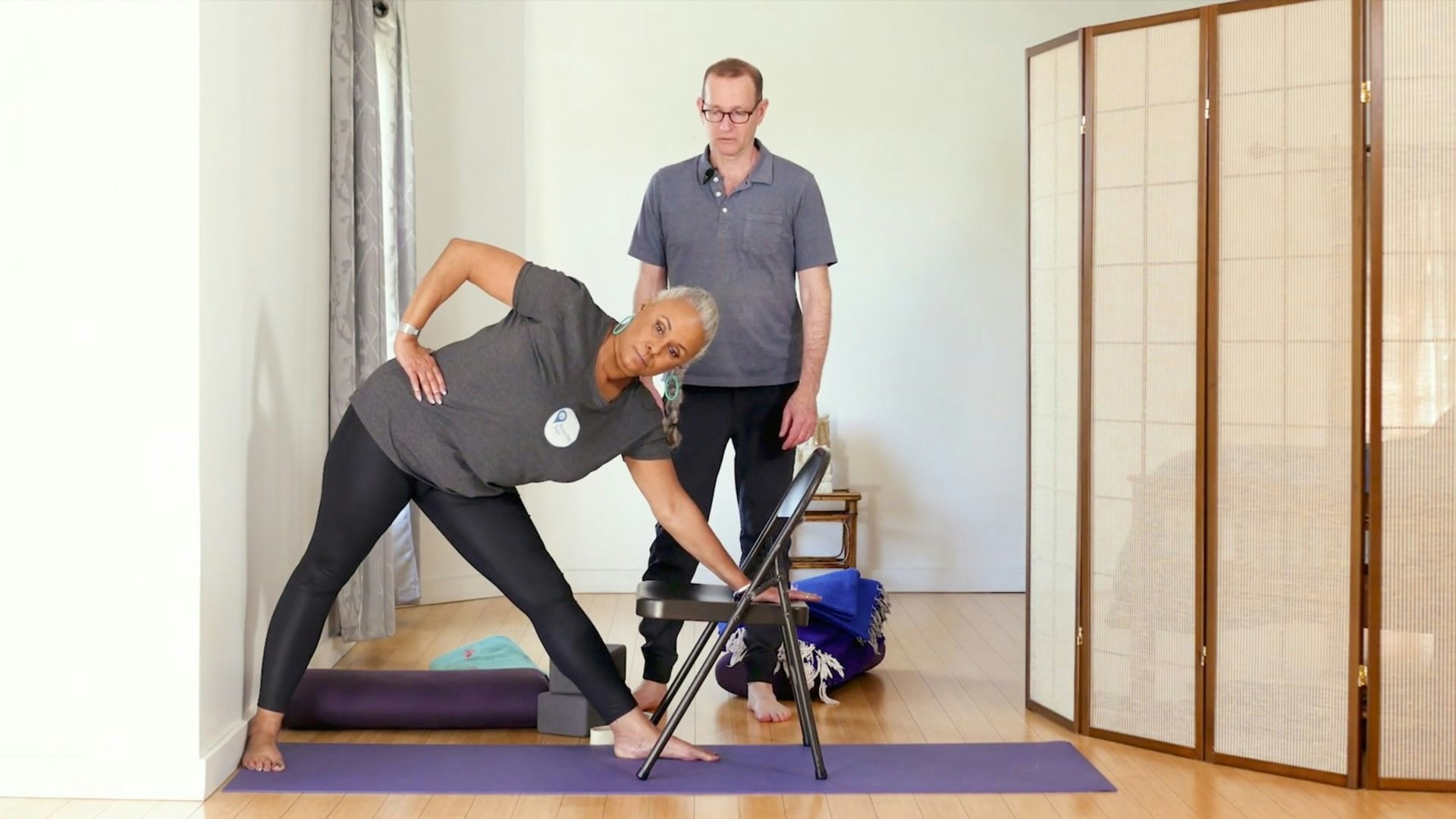 You’ll begin with seated upper and lower body warm-ups before moving on to a standing wall practice that includes a standing forward fold, triangle, and side angle pose. After that comes a floor series, where you’ll use a bolster and blankets to find comfort in child’s pose, a supine twist, and savasana.