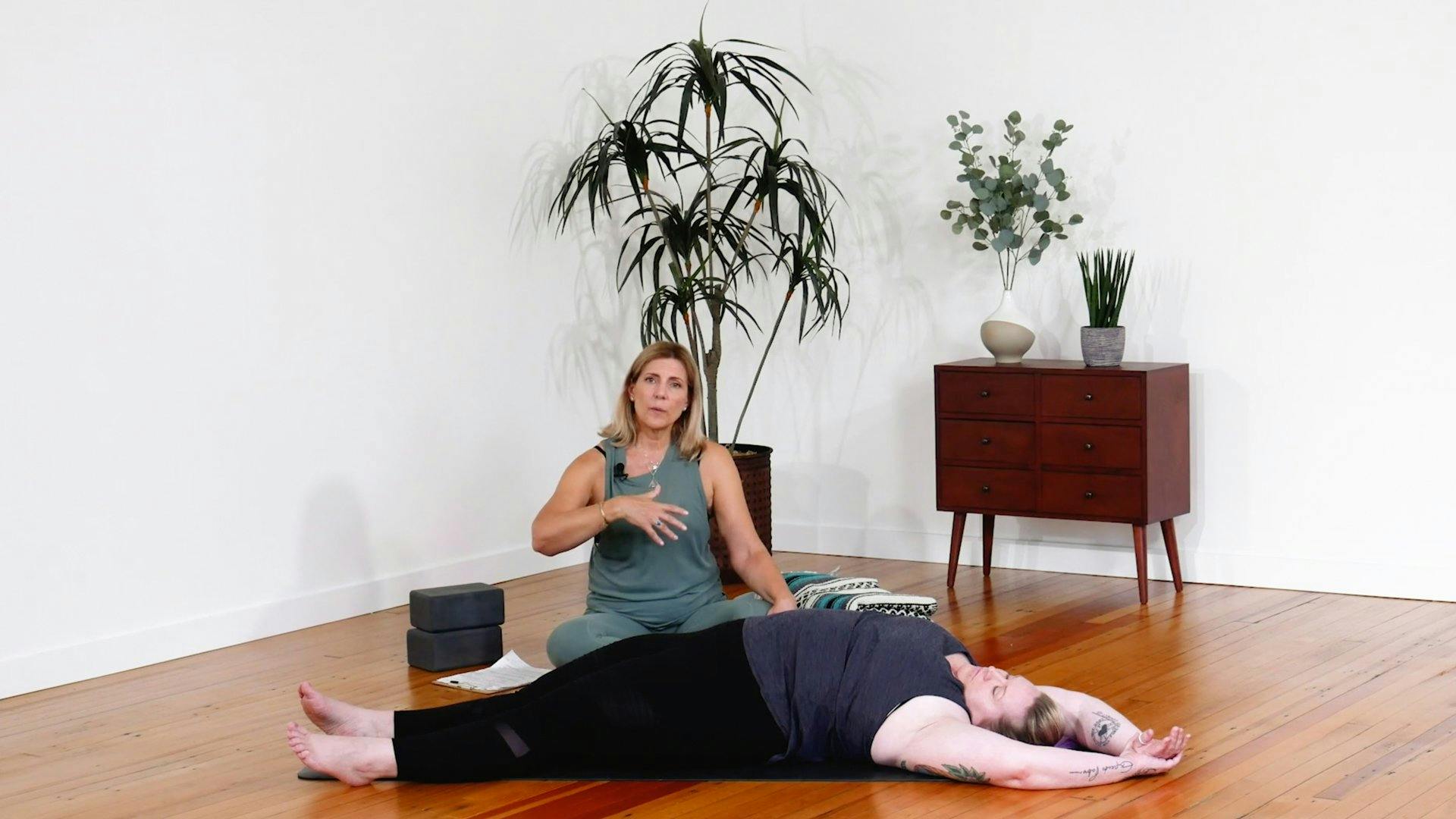 Focus on the fifth kosha (layer or sheath) of the body, also known as the anandamaya kosha (bliss body). Begin with a block- and bolster-supported bound angle pose to let go of tension and relish the sweet stillness this pose invites. You’ll then move into a twist, followed by a supported dragonfly, and a supine side-body opener. Enjoy this calming experience and use it to reflect on what makes you feel joyful.