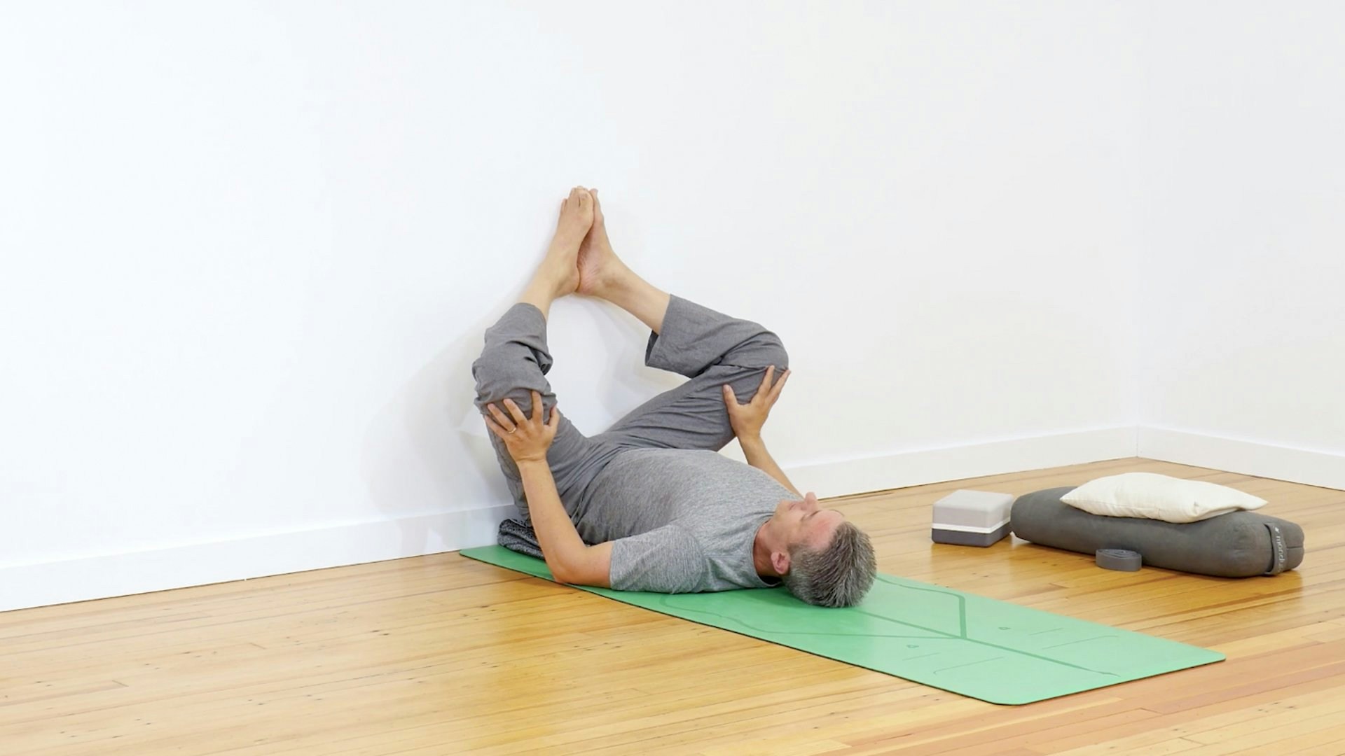 Let go of effort in this restorative practice that begins with legs up the wall pose. After that comes supported hip openers, a blanket- and pillow-supported backbend, strap-supported leg stretches, and more, before a concluding body awareness practice in savasana. Have a small pillow or a sandbag available.