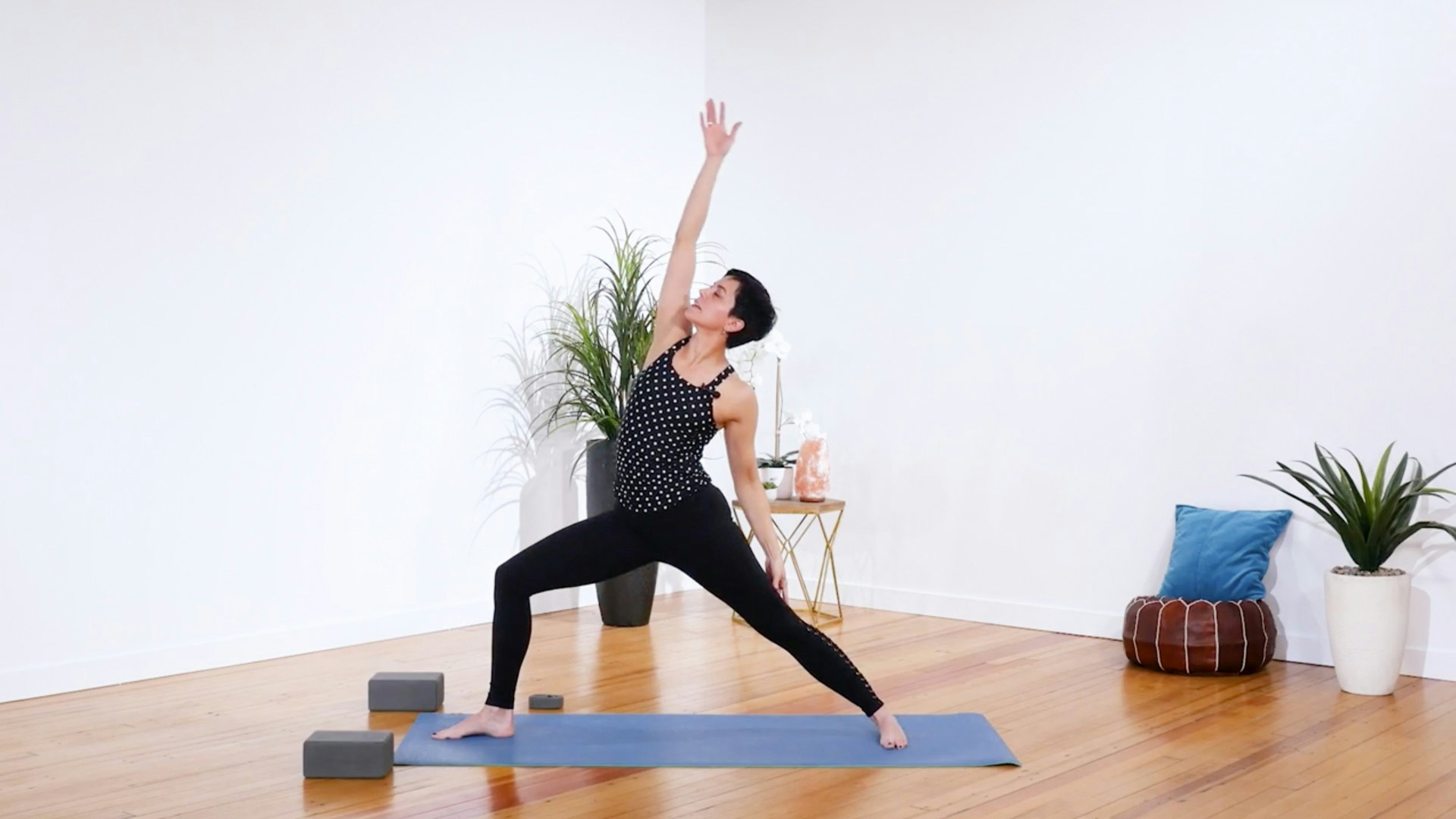 Enjoy sun salutations, flowing cobra variations, a side angle to skater to half moon flow, “lounge lizard” variations,” easy wind-down stretches, and more.
