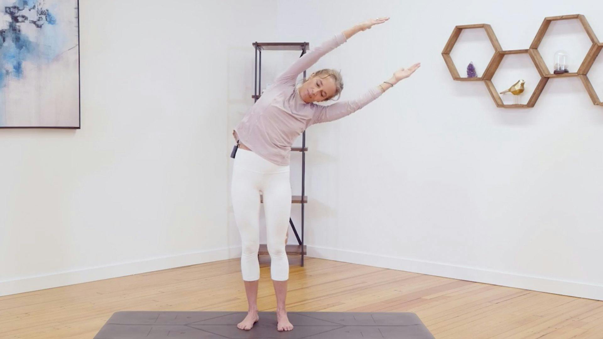 You’ll begin with seated practices that involve twisting, forward folding, and breathwork. After that comes an upward plank flow that integrates breath of fire, a squat flow, a standing forward fold flow, a standing side bend flow, and more, before a concluding 11-minute mantra meditation.