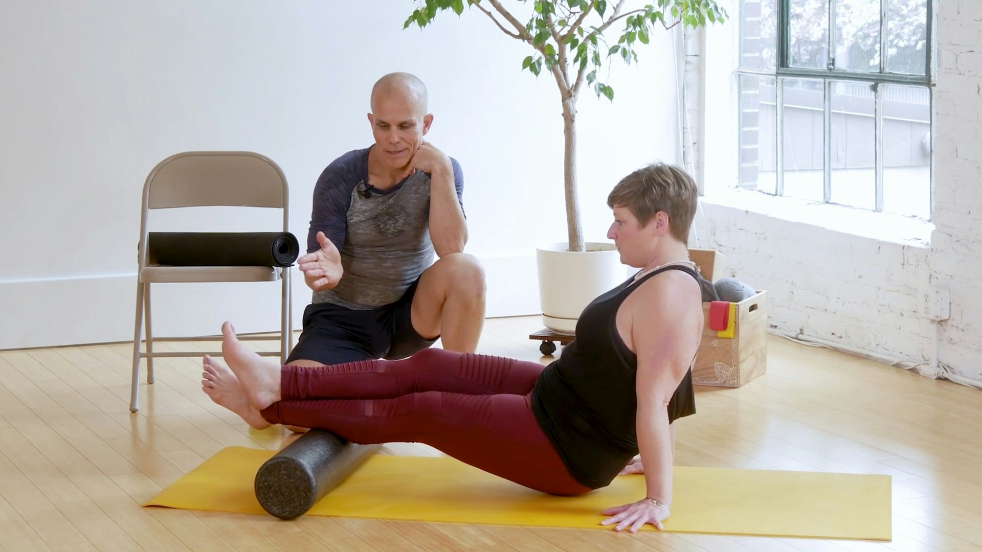 Props: foam roller, chair, soft ball or therapy ball, resistance band