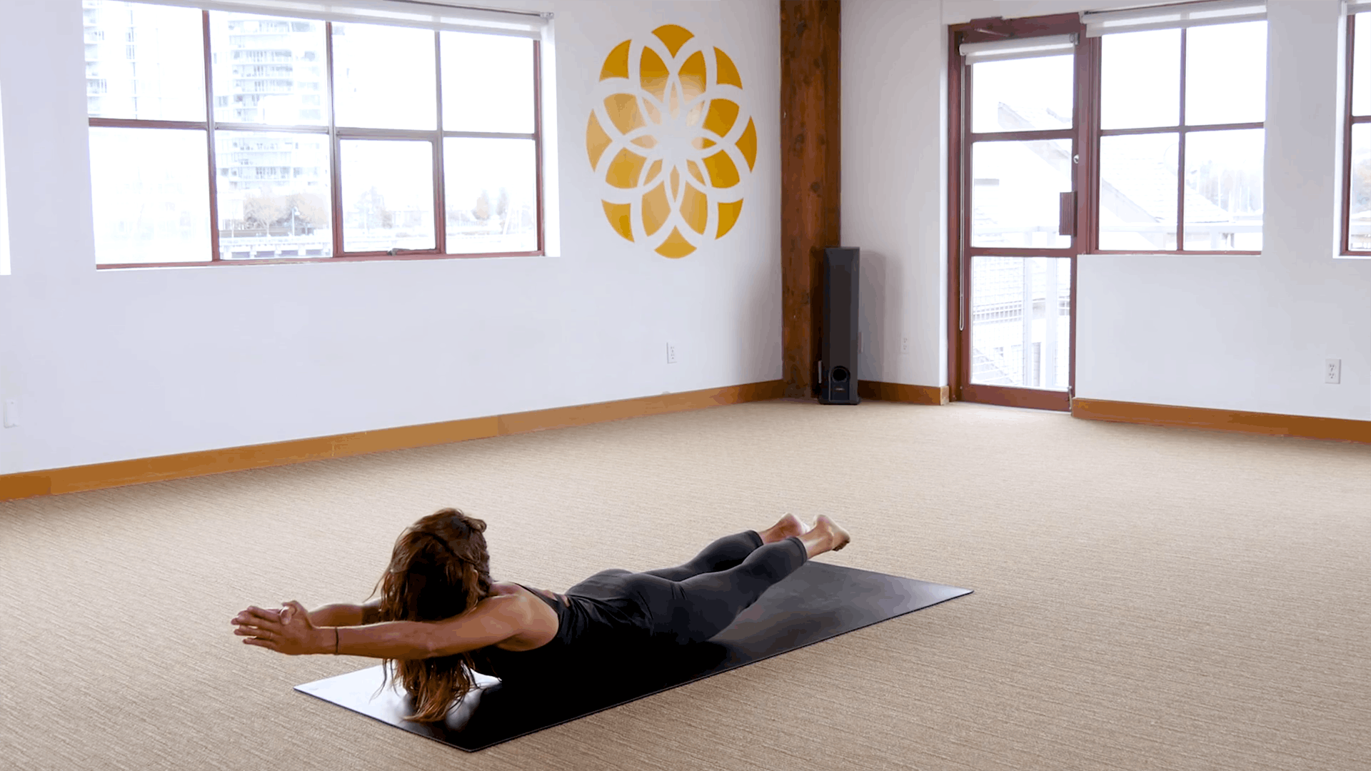 You’ll practice vigorous cat-cows, breath of fire in poses like navasana (boat pose) and malasana (squat), leg lifts in plank, down dog knee-to-nose “crunches”, standing balance work, side plank lifts, and more.