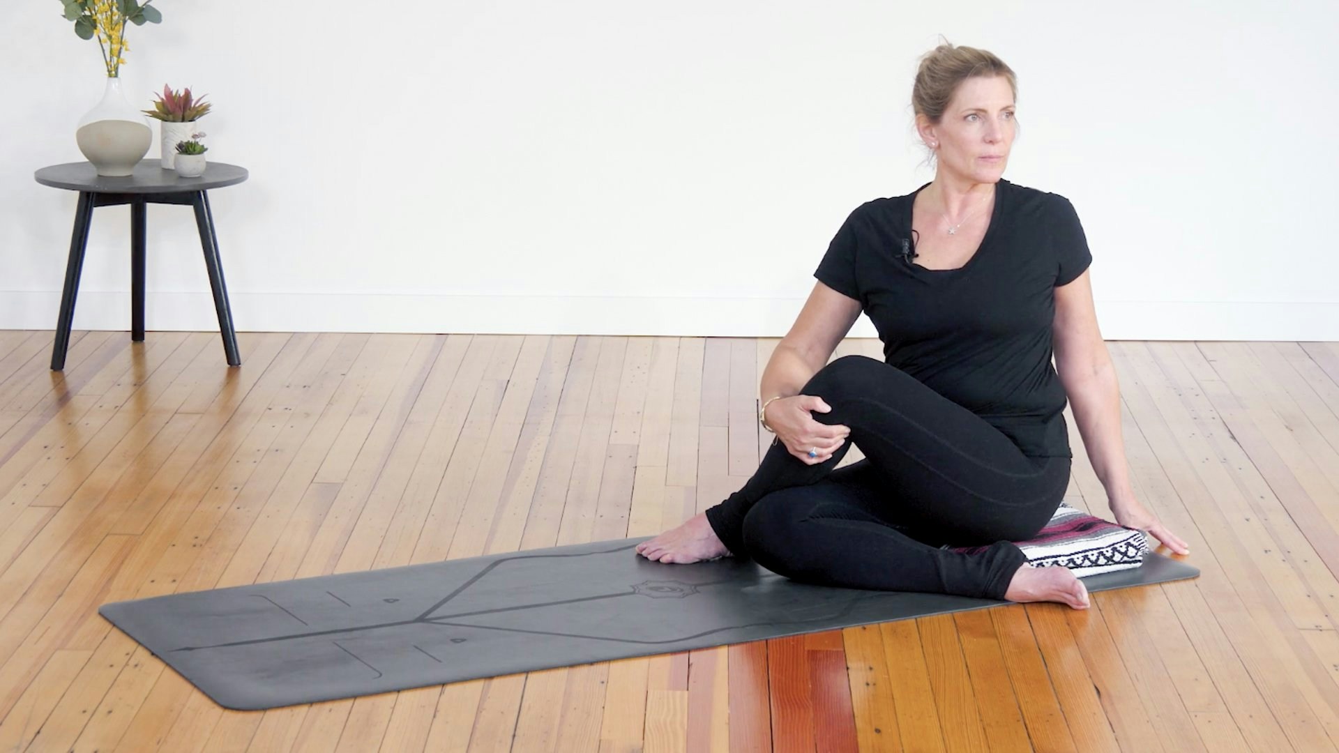 Practice begins by guiding you through a belly-down savasana variation, then moves on to a variety of hip openers such as low lunges and cow face pose at the wall, before finishing with a wide-legged child’s pose, seated twists, and a deep savasana.