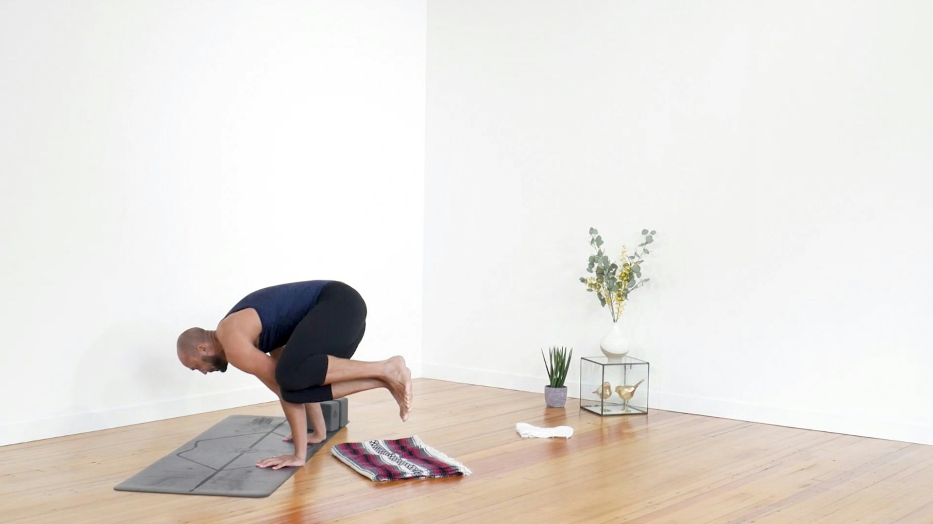 After that, you’ll continue to strengthen with a “boat rowing kriya” in chair pose, head taps on a block in crow to prep for sirsasana ll (tripod headstand), enter side crow from a blanket perch, transition from tripod headstand to crow back to tripod headstand, and more.