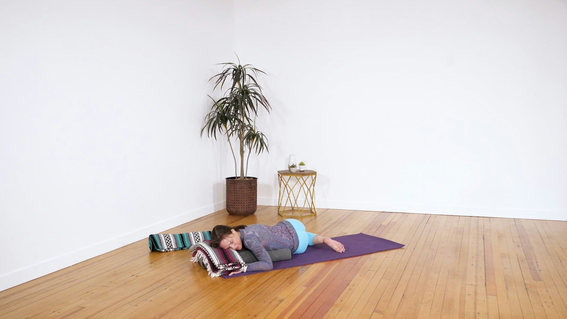 Cultivate the mood of rest and relaxation with this deeply calming restorative-style class. This practice includes reclined supta baddha konasana, bharadvajasana, supta matsyendrasana, versions of supta padangusthasana, and more. In addition to your bolster and strap, have a few blankets available for this one, and enjoy this delightful practice.