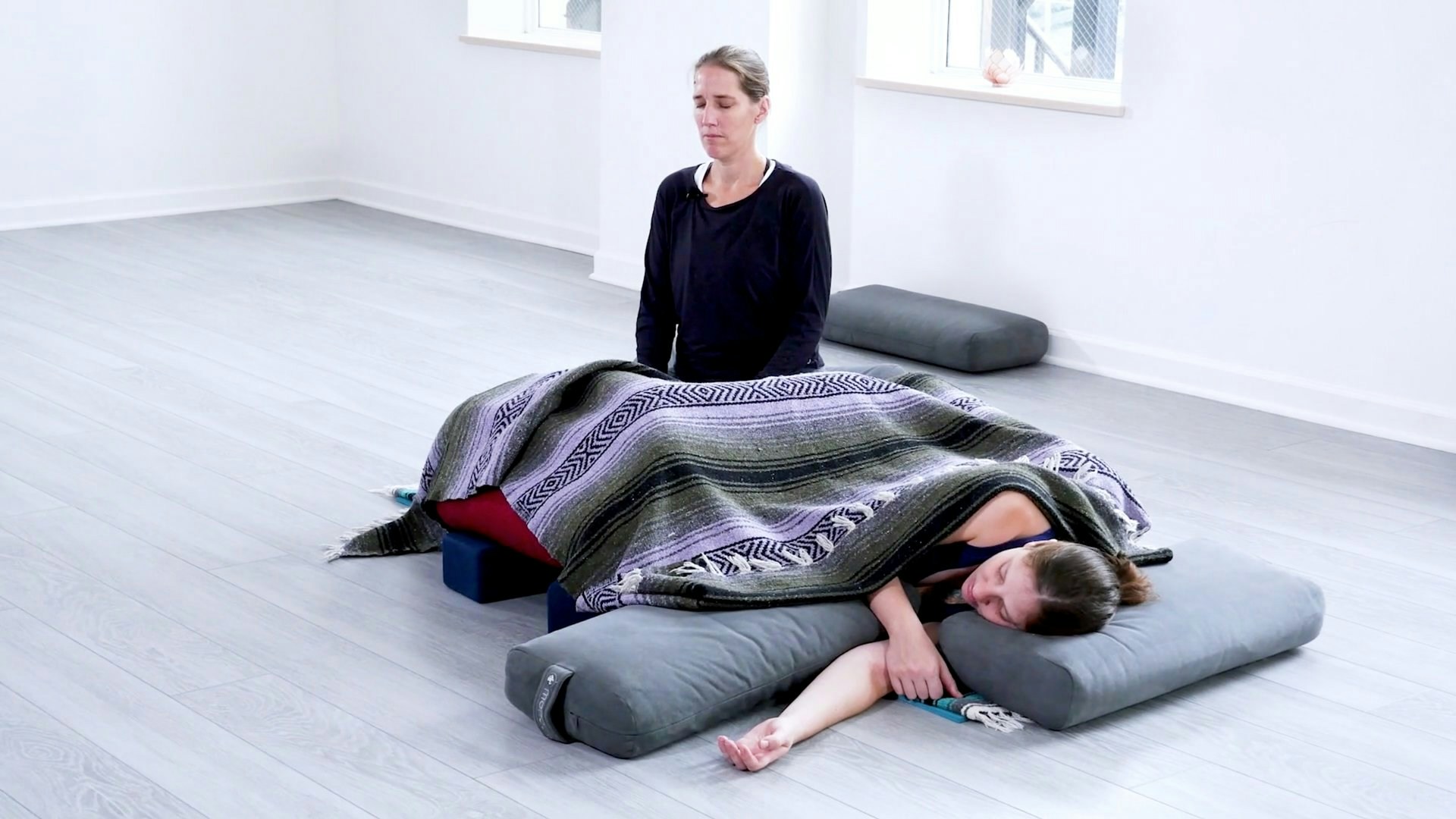 In this calming restorative practice, you’ll use your mind, body, and breath to move into a place of peace. Before you begin, you’ll learn how to set yourself up in a restorative side-lying savasana (a left side-lying savasana is often considered optimal during and after the second trimester of pregnancy). Have a few blankets, bolsters (or cushions), and blocks available for this one.