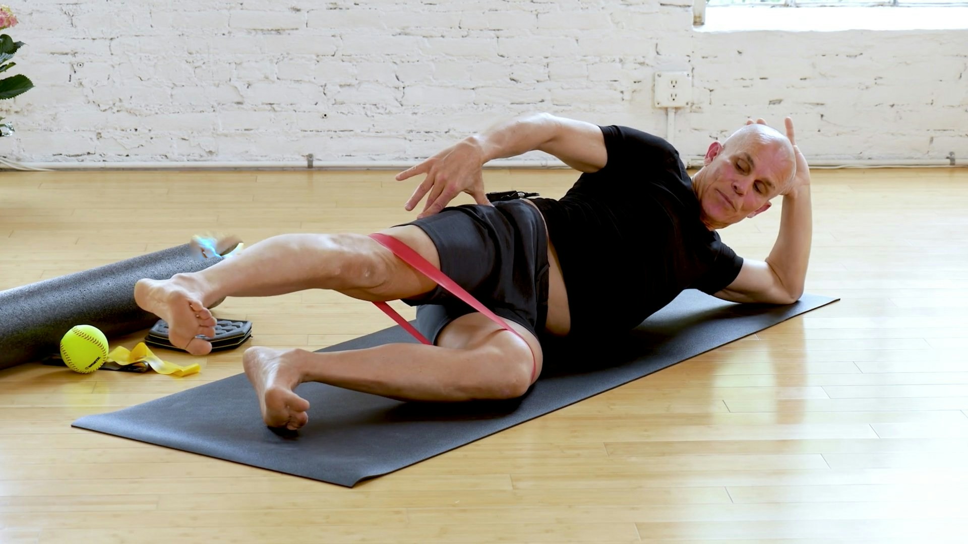 Work your hams and glutes with this practice. You’ll lie on your side and do strengthening muscle contractions for your hips and glutes, followed by prone leg lifts, bridge lifts, single-leg squat variations, and more. Roll out your glutes at the end before you wind down with a reclined figure four stretch. We recommend using a small resistance band (or leg weights), a towel, and a tennis ball for some of the exercises in this class, but you could go without them.