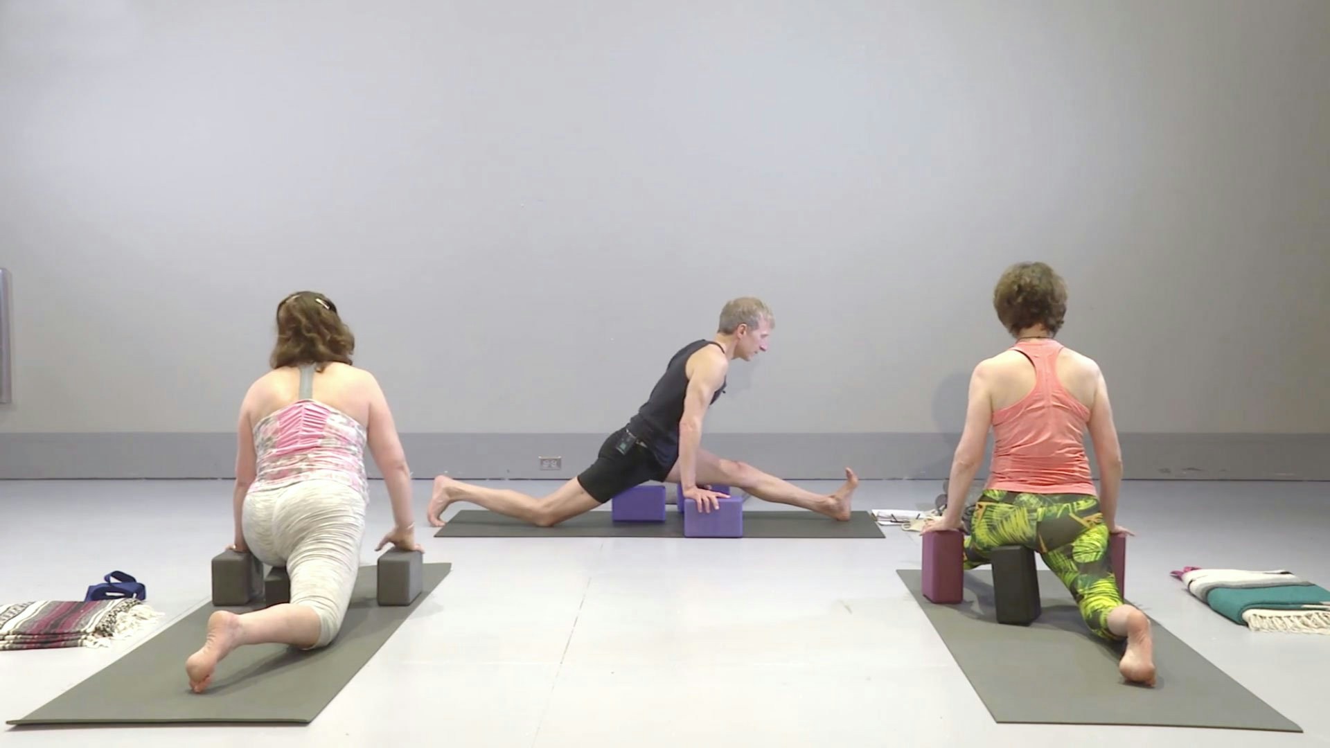 This heart-inspired hip class is all about practicing self-acceptance and cultivating happiness. You’ll begin with “feeling studies” to explore the nuances of hip and leg alignment in standing forward bend, downward dog, and lunges. After that, you’ll go deeper into the hips with a prone “salamander twist,” sucirandhrasana(reclined pigeon), twisted pigeon variations, half and full hanumanasana (splits), and more. Have an extra block handy or use a bolster or books for hip support in the splits.