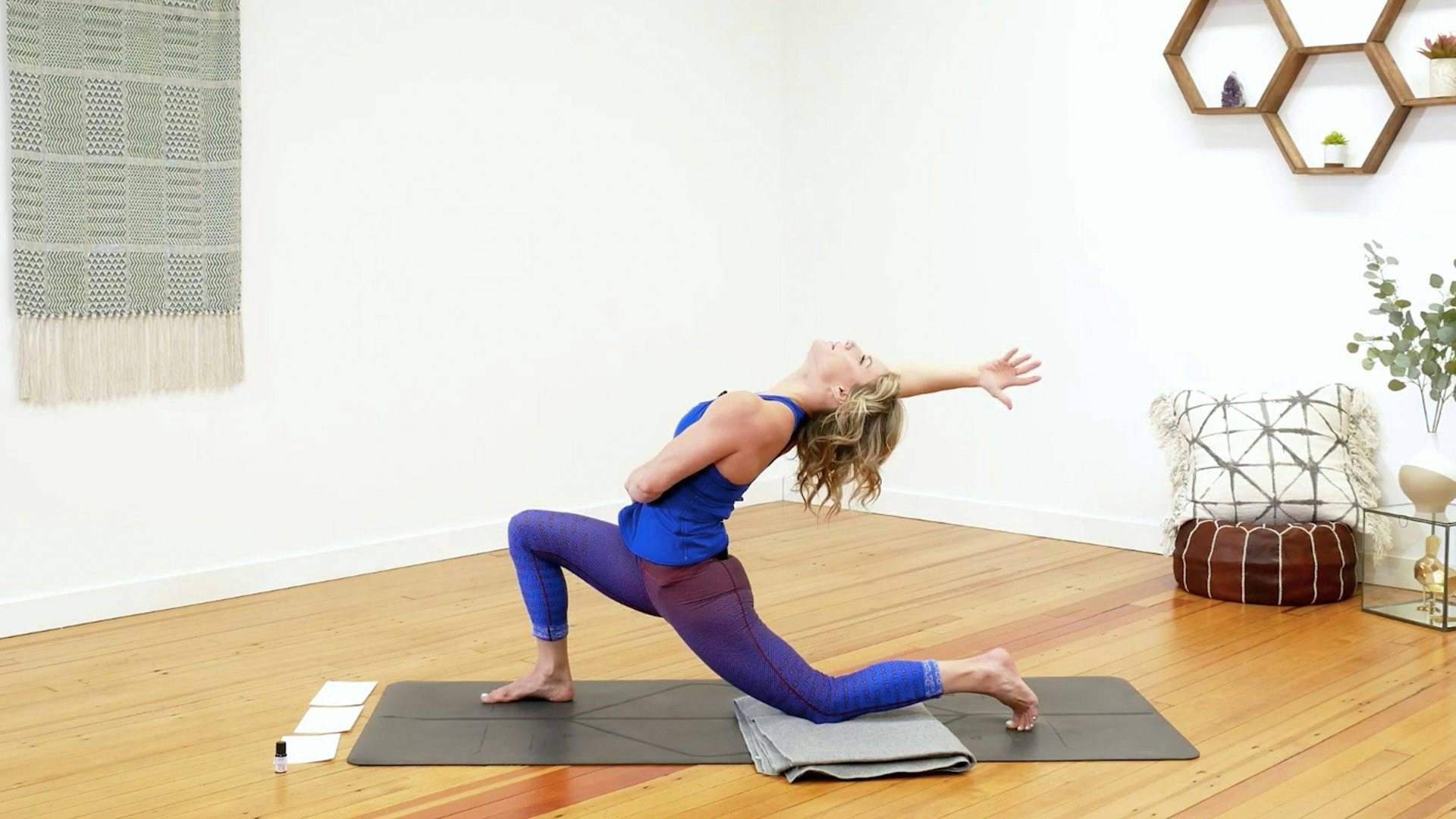 Wind down with supine hip-opening practices and a guided affirmation before savasana. Have a lavender scented essential oil on hand, or another scent that you prefer.