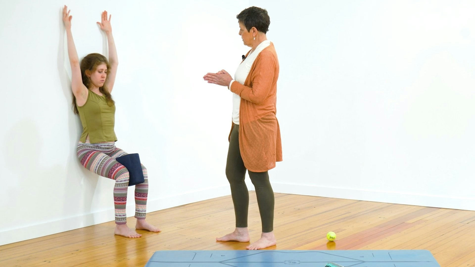 In this practice for the knees and hips, begin with a warm-up where you can observe your current alignment. Then, move on to a mindful hip- and knee-strengthening sequence that includes gentle blanket slides from seated, wall-and block-supported lunges, a posture check, and a supine pelvic strengthening exercise.