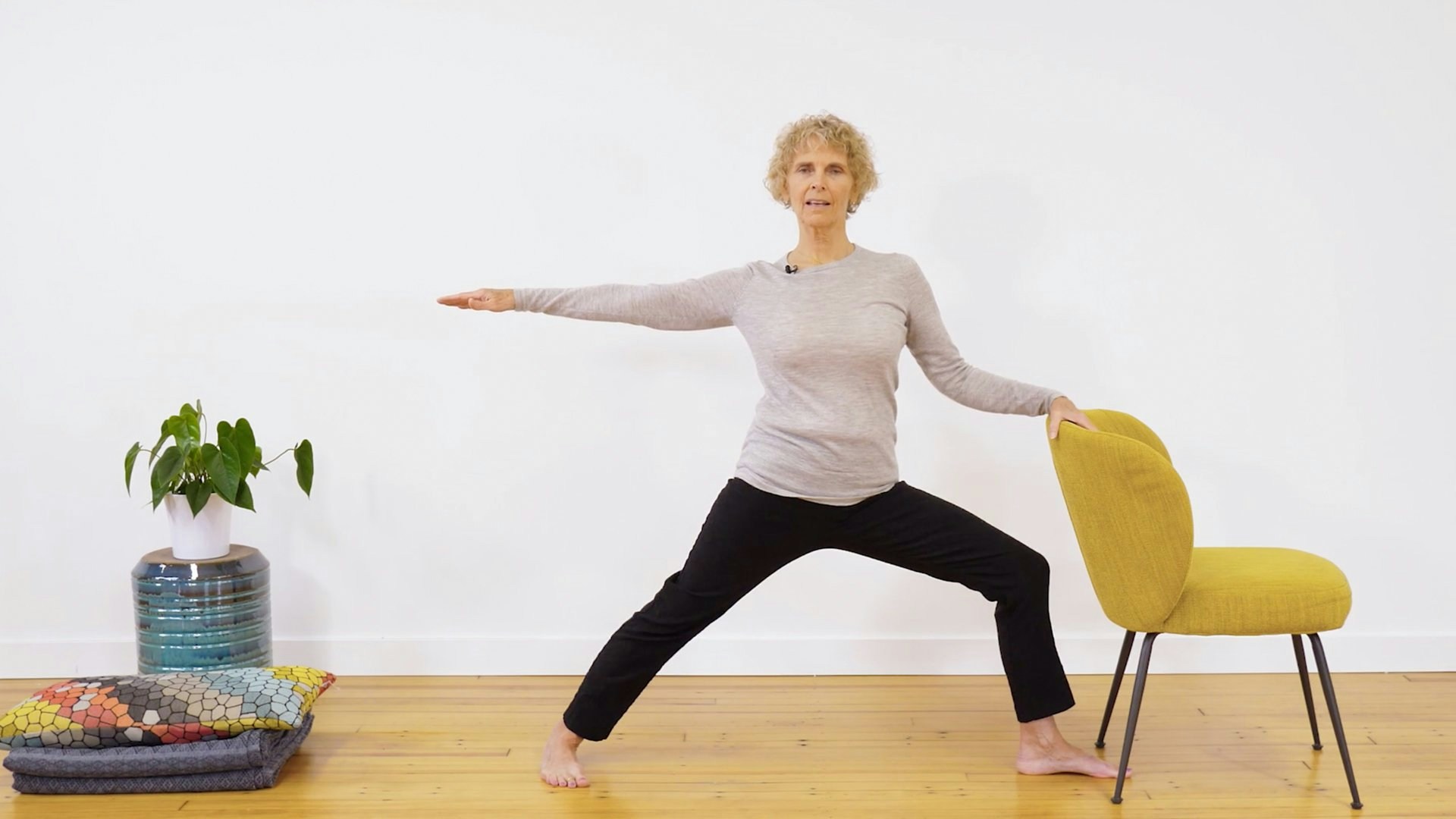 In this mostly-standing sequence, you’ll use the support of a chair to explore foundational yoga poses. After a cat-cow warm-up to release back tension, you’ll work with your alignment in down dog, cobra, triangle, warrior ll, tree pose, and more.
