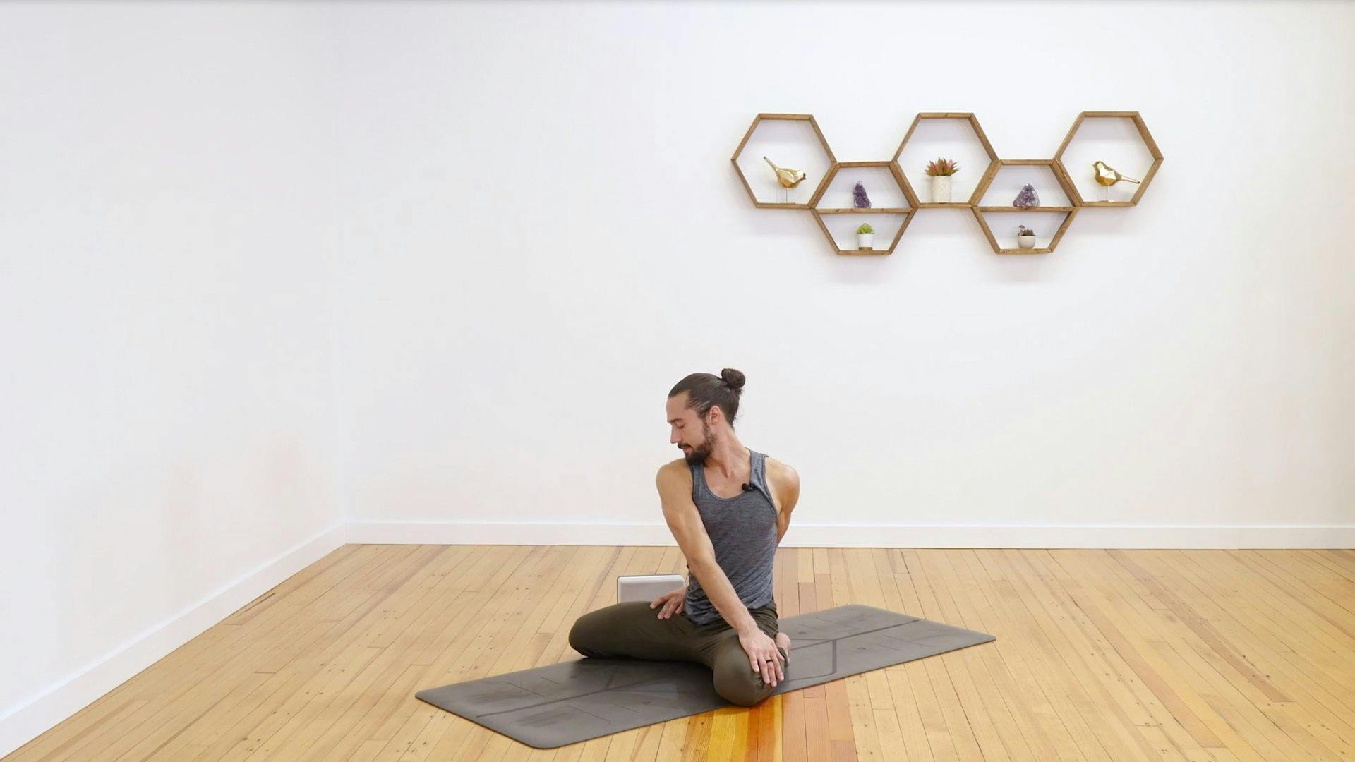 This class begins with a whole-body warm-up that includes standing hip mobility exercises. After that you’ll do sun salutes, a horse stance flow, dolphin variations, a squat to reverse tabletop variation/wheel flow, seated forward bends, and more.