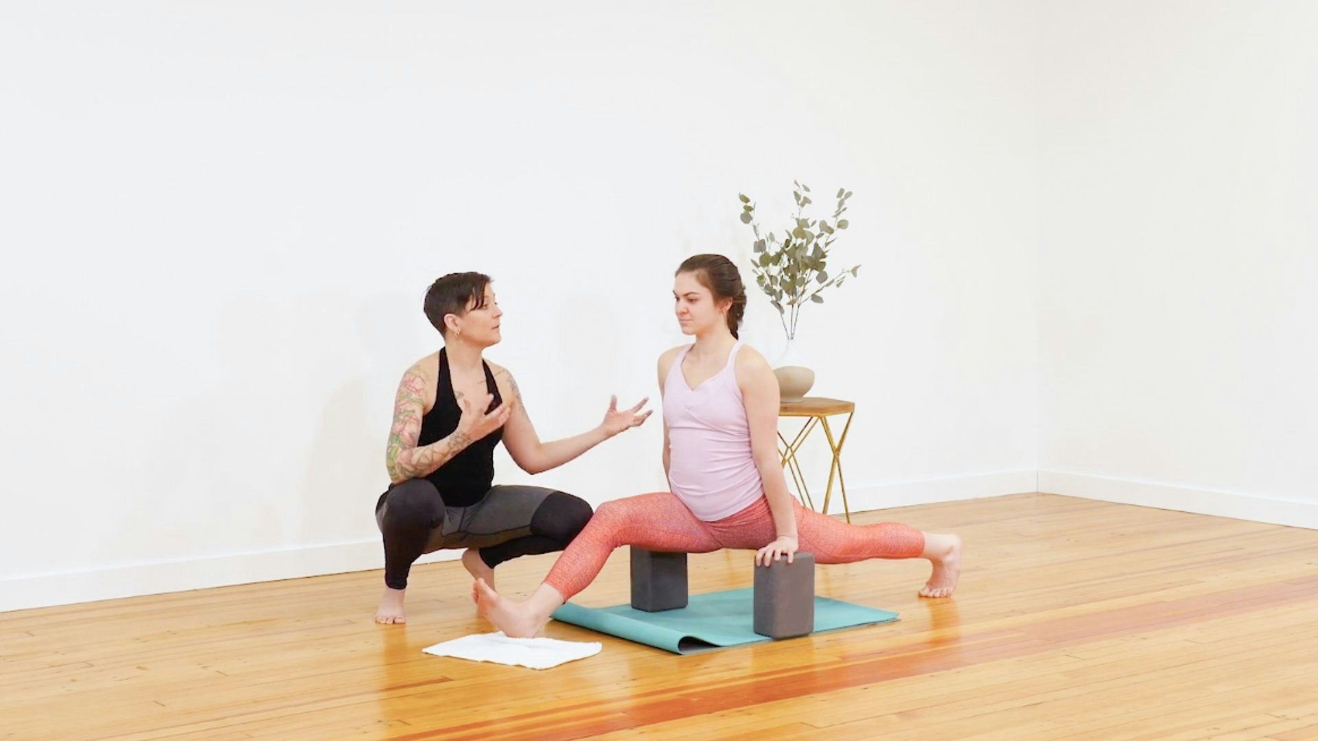 Using props, you’ll then proceed step-by-step into hanumanasana, where you’ll focus on key actions in the back leg.