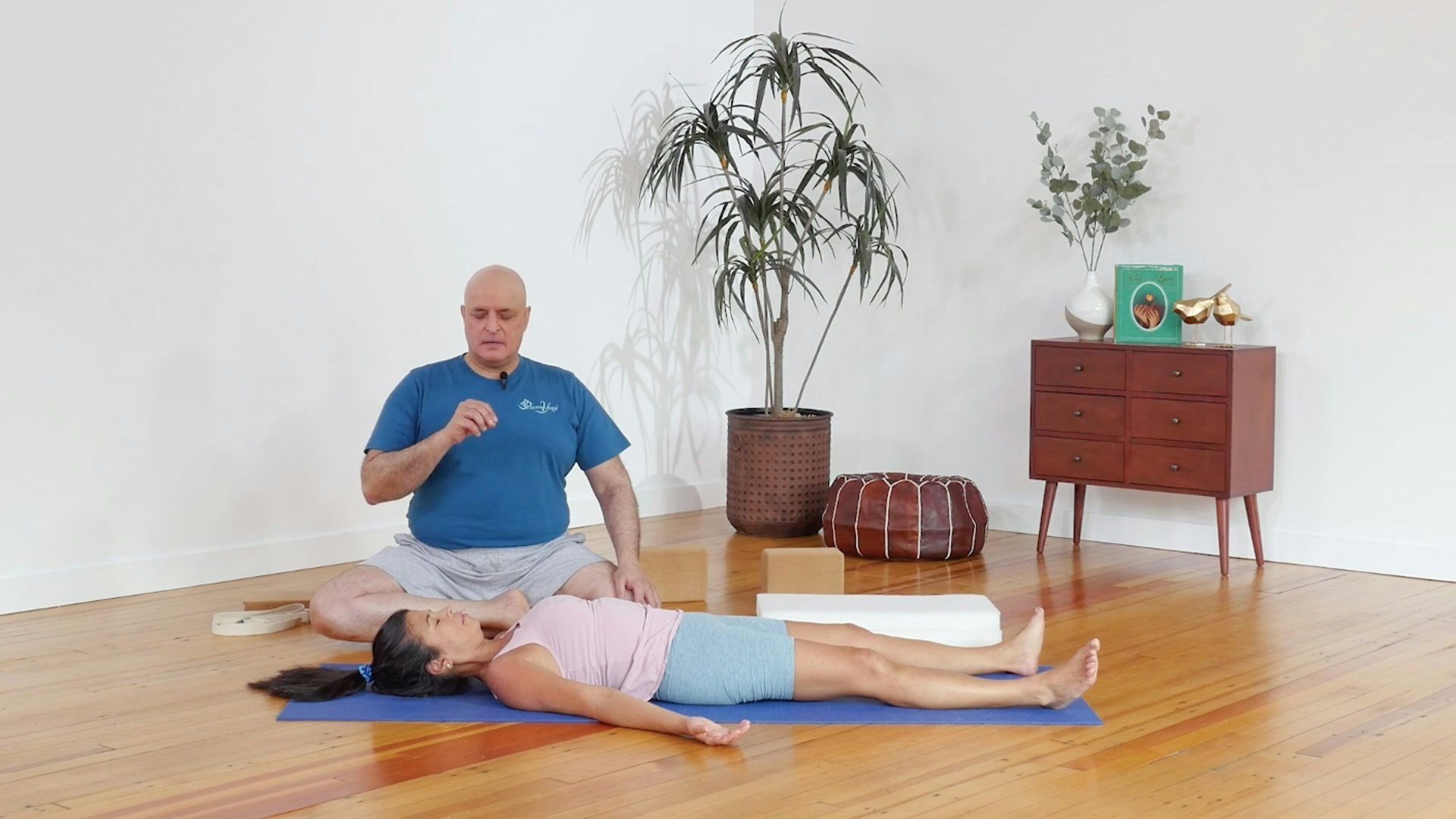 You’ll begin seated, chanting om, before moving on to seated warm-ups and three rounds of surya namaskar. After that, you’ll practice a series of active standing poses (such as triangle, revolved triangle, and warrior I), active backbends (bridge and wheel), and reclined hand to big toe pose before lying back for a guided relaxation in savasana.