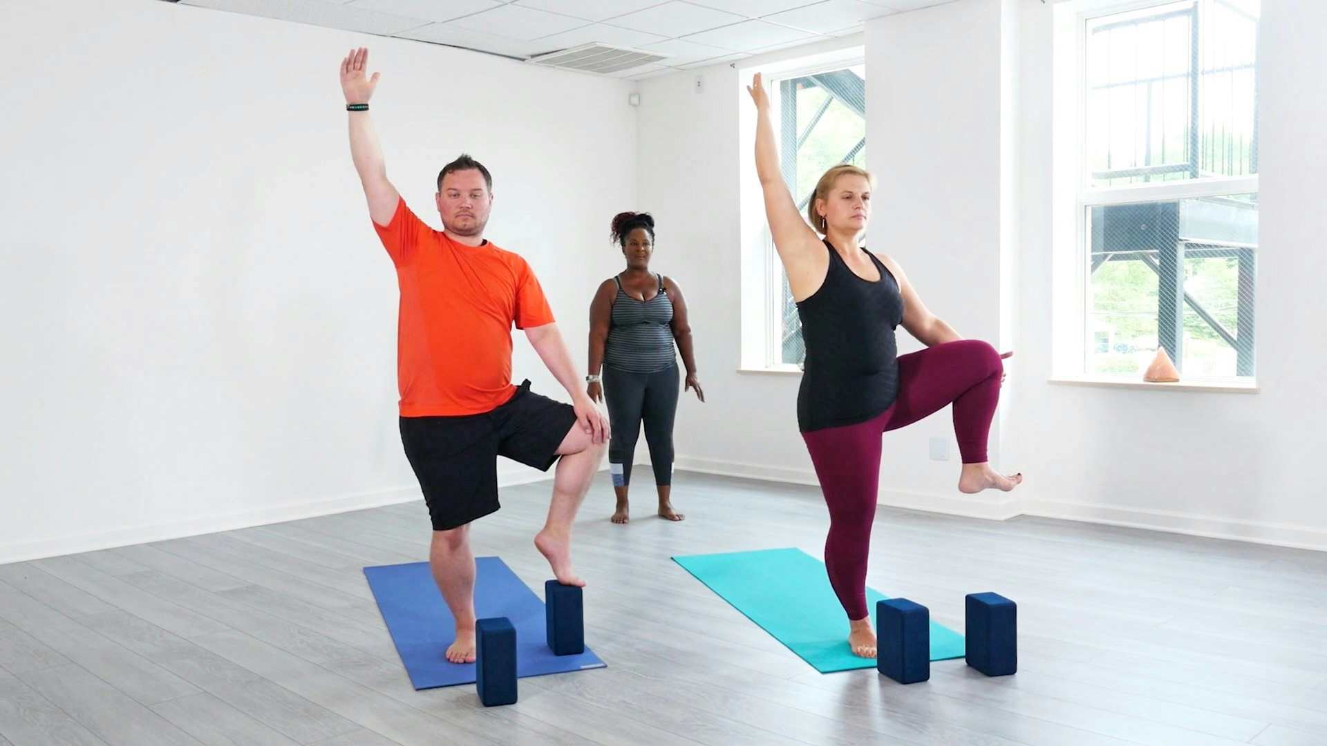 In this progressive balance sequence, you get to choose the intensity of your practice. Throughout class, different pose variations are demoed by two students, so you can decide which one you want to do. Begin with a centering practice and a warm-up before moving into a practice where you’ll do balance poses like tree, figure four, and warrior lll/standing split variations in between sun salutes. After that, you’ll do a final challenge—a standing hand-to-knee pose. Then wind down and conclude in savasana.
