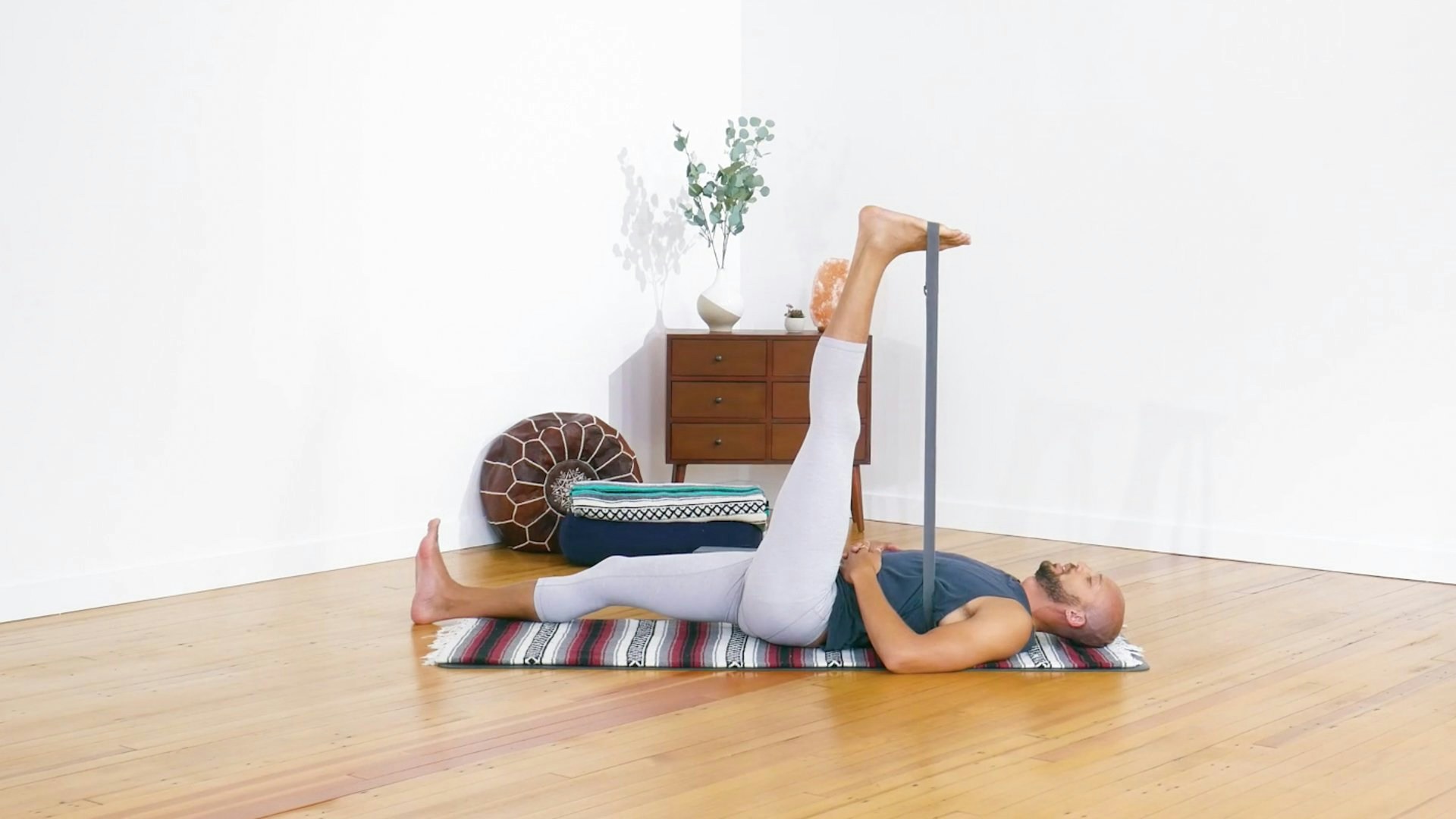 This hip and hamstring-focused restorative class is all about subtle movements and releasing slowly. You’ll begin on your back with a warm-up followed by long holds in strap-supported leg stretches. After that, you’ll move into a strap-supported supta baddha konasana (reclined bound angle pose), where you can continue to release effort little by little.