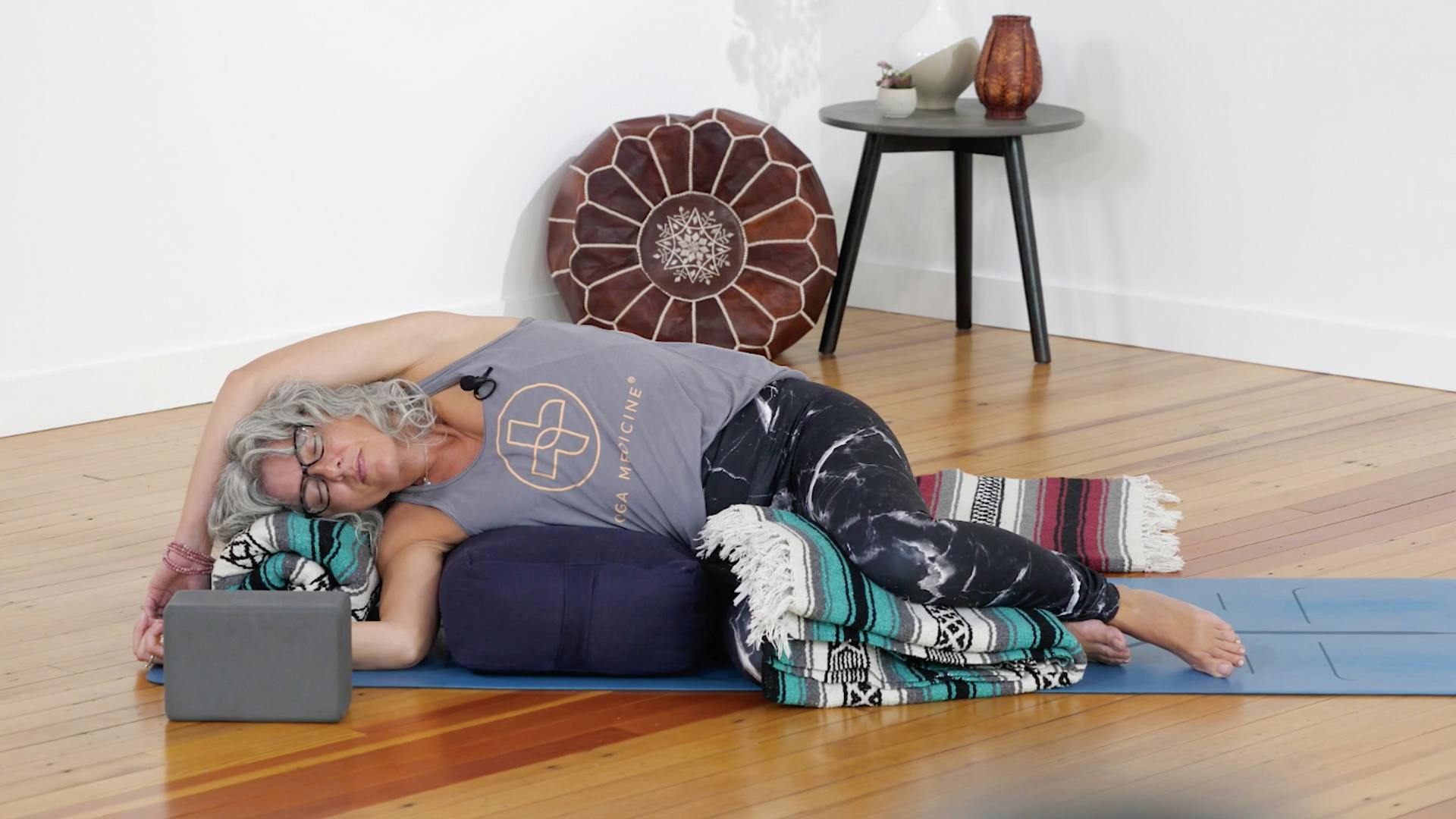 Renew your energy and explore sensation with this restorative class that’s not only restful but activating. You’ll practice crocodile with a blanket roll under your belly, a side-lying side bend with bolster and blanket support, a supported supine twist, and more. Have two blankets available.