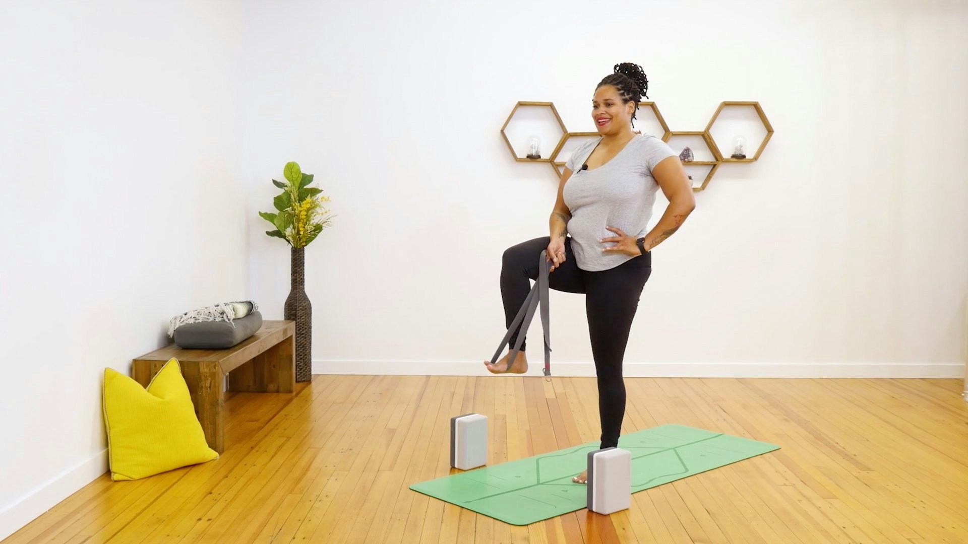 In this lighthearted yoga class, you’ll focus primarily on standing poses designed to open your hips and hamstrings. You’ll do familiar poses like revolved triangle, pyramid, a strap-supported head to big toe pose, dolphin, half splits, and more. Then, you’ll conclude with a check-in from down dog to see how your legs are feeling after the activating standing work you did.