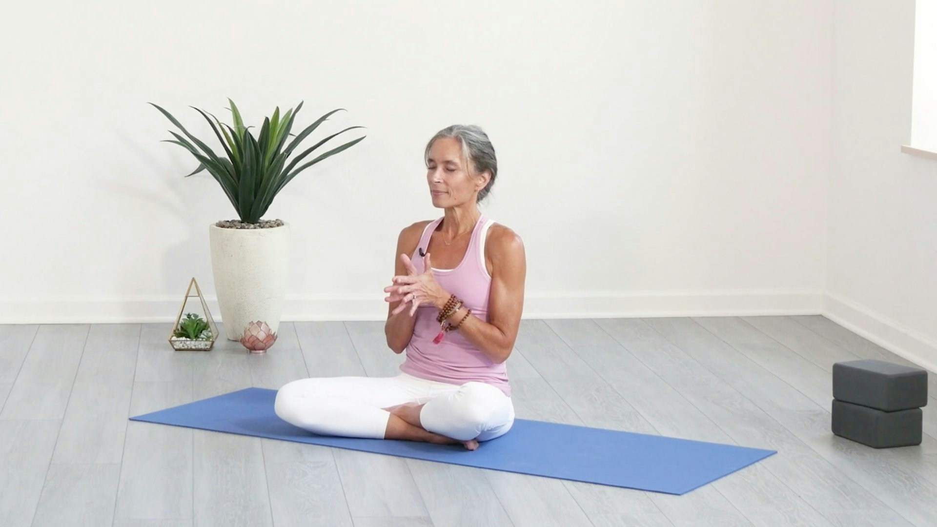 Class begins with a seated warm-up. After that, you’ll begin the kriya, which includes neck rolls, energizing breath of fire practices, a subtle mudra practice, a short down dog/child’s pose flow, and more.