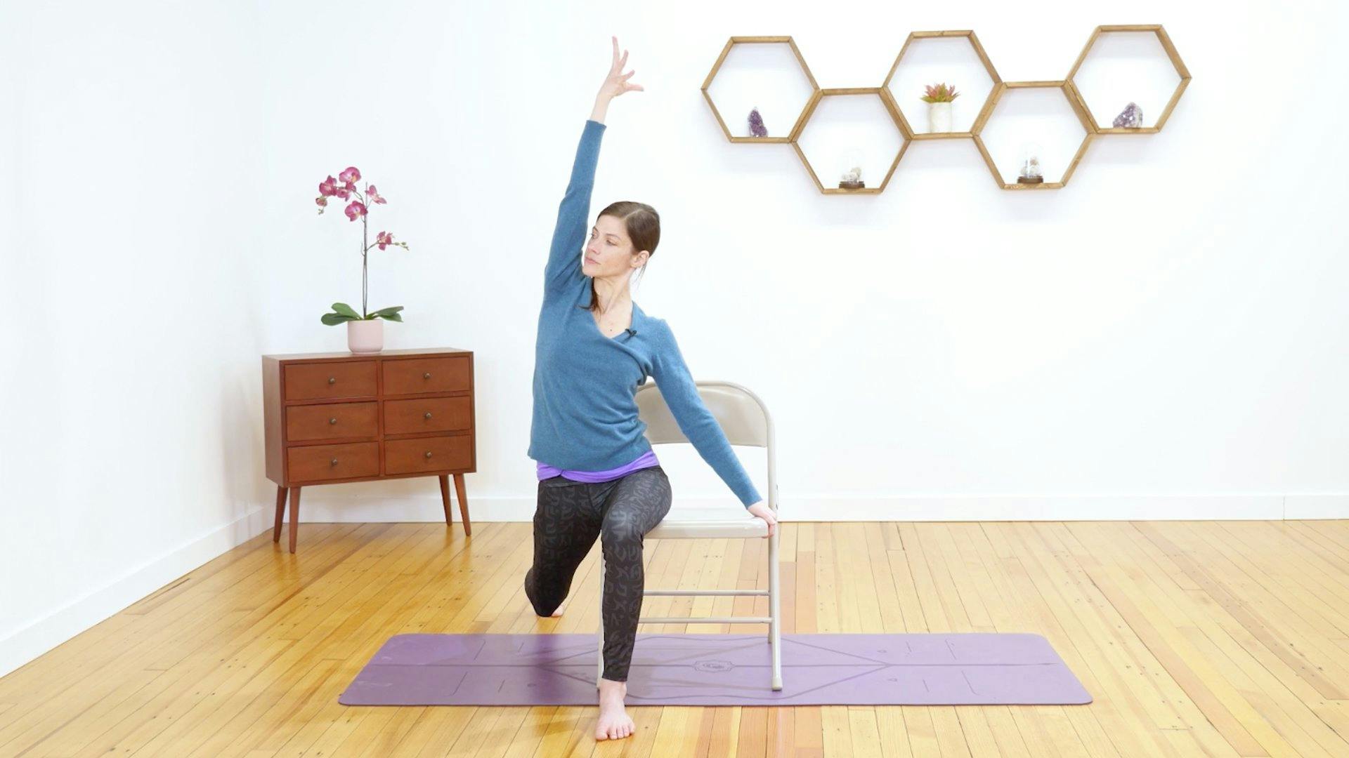 In this customizable chair yoga class, explore opportunities to approach classic poses in new ways. After a warm-up, you’ll progress into a sequence that includes lots of twist variations, core strengthening, and glute strengthening poses.