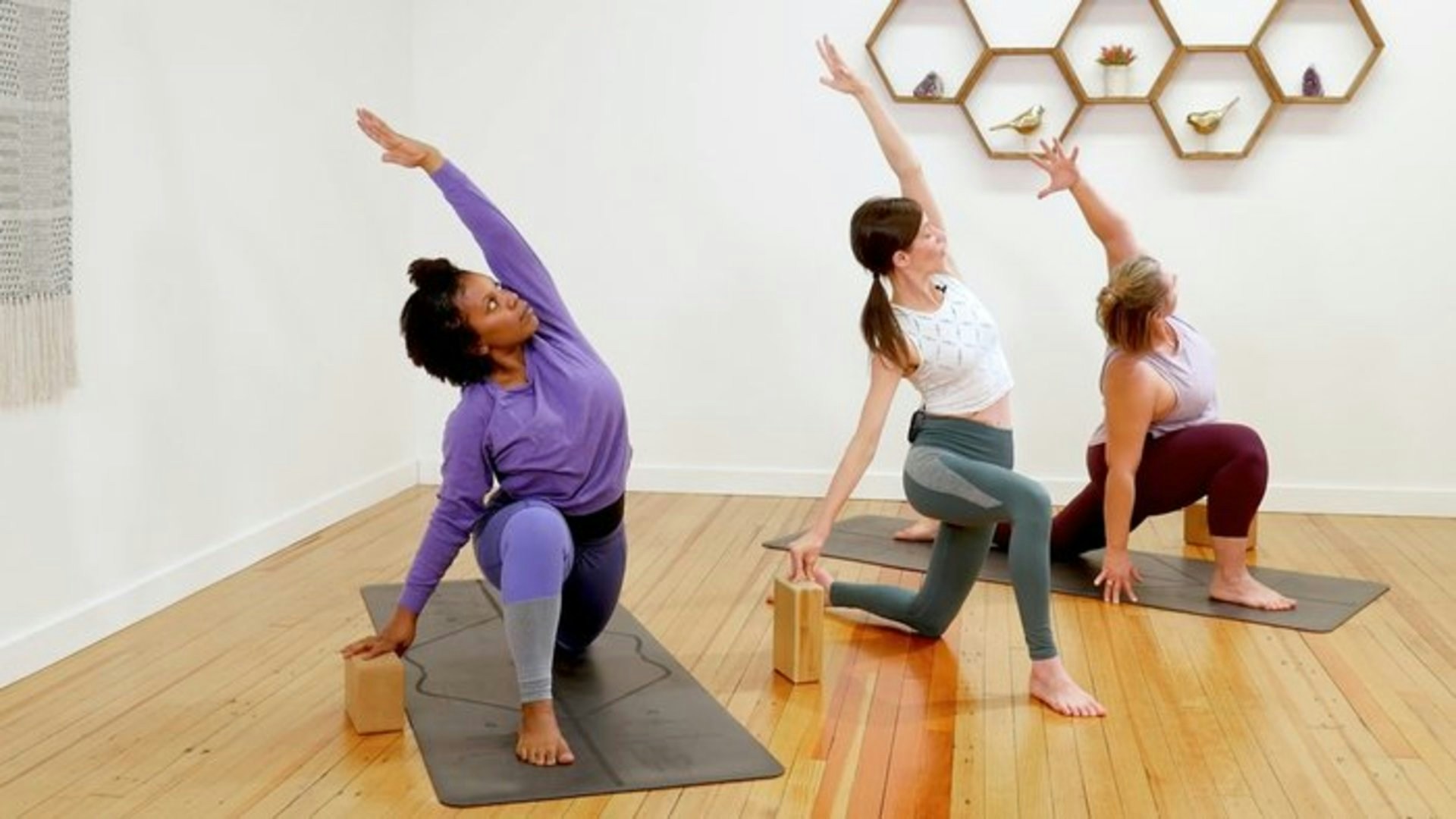 Move with your breath in this side body flow. The class begins with stretches in virasana and a child’s pose variation. After that, you’ll move through sun salutes, lunge variations, a reverse warrior to side angle to triangle sequence, and more before doing a wind-down sequence and concluding with a brief meditation.