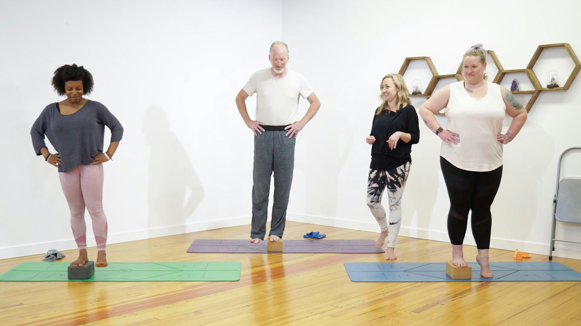 In this strength-building class, you’ll focus on building lateral hip stability through a progressive standing series that eventually leads to one-legged balance practices (including warrior III flows while standing on a block). You will only need one block for this practice. Having a wall and a chair handy are optional, but it could be helpful.