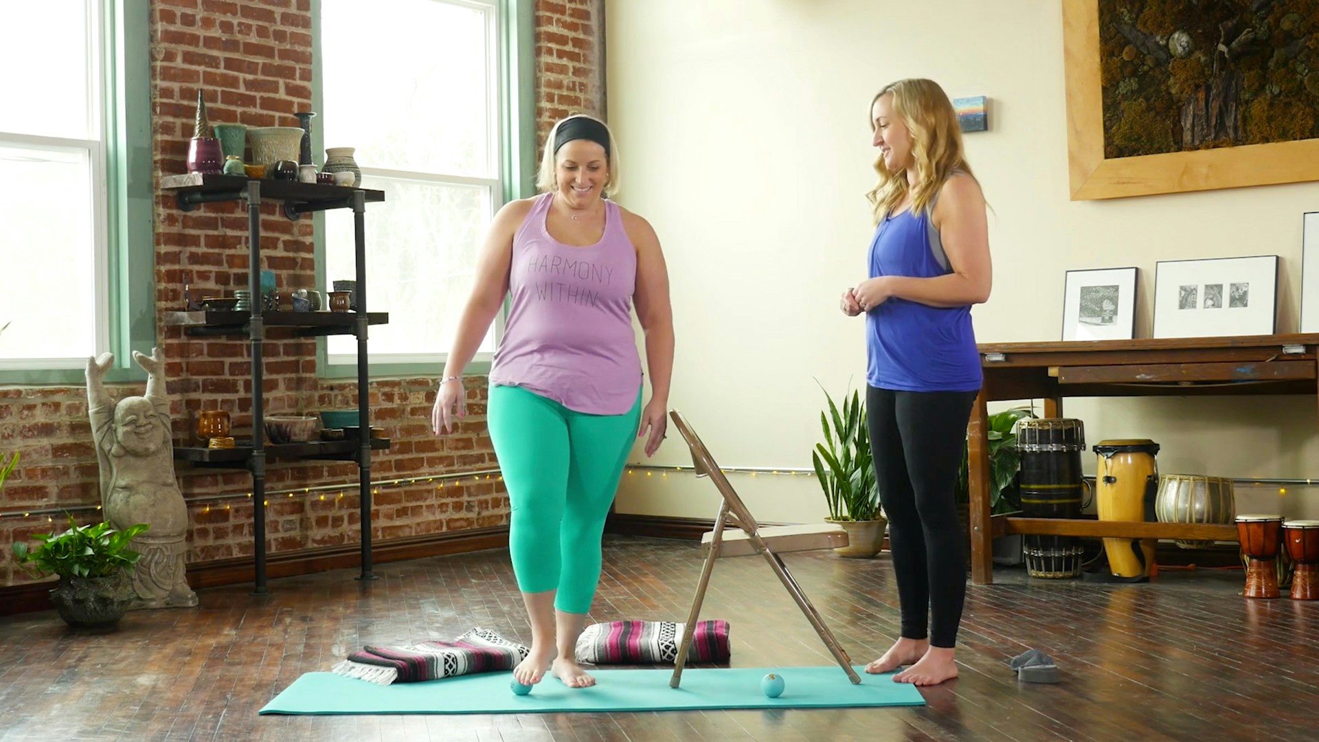 Props: massage balls, chair, blanket, wall/corner (optional)