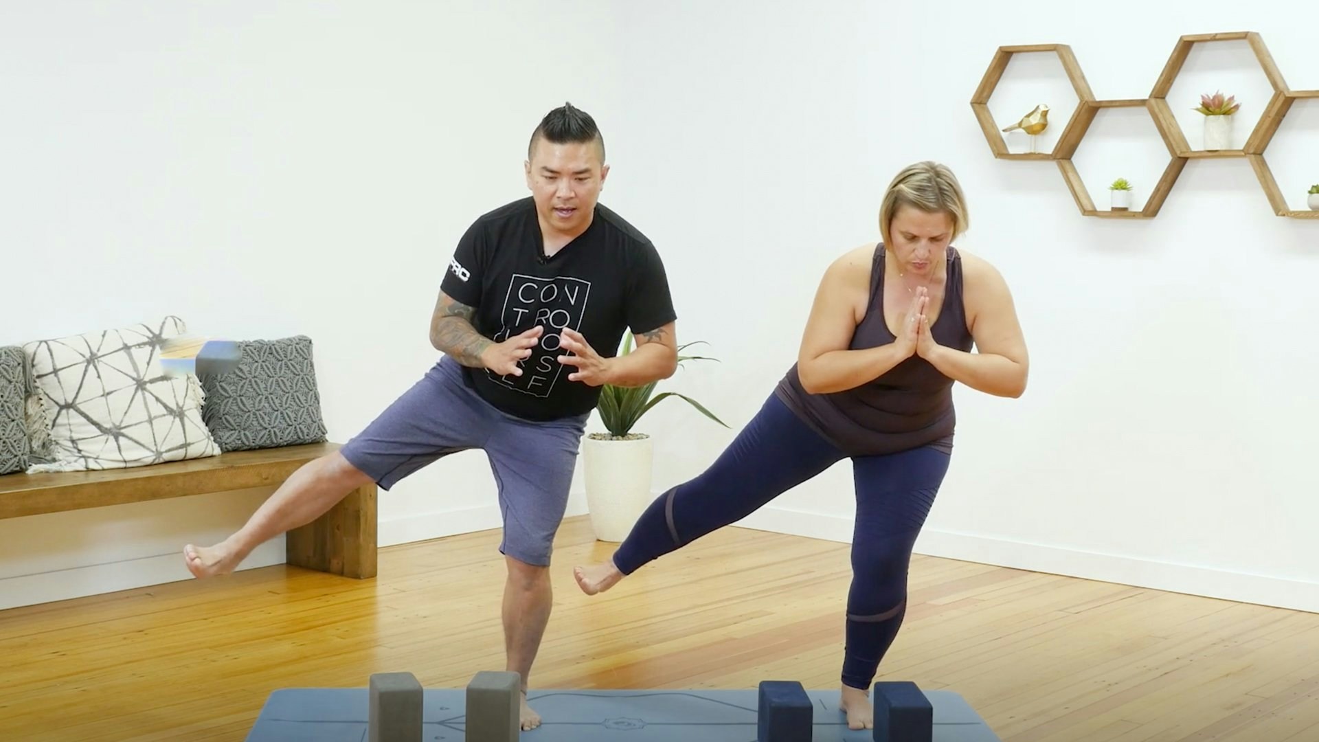 Bike a lot? This stretch and strengthen class is designed to mobilize tight spots, such as your hip flexors, your quads, and your low back. You’ll begin with a block-supported forward fold before moving on to standing side bends, strengthening balance work, prone core strengtheners, lots of resistance lunges, a standing split to pistol squat transition, and more. Finish the sequence in a “half hero’s pose” variation and a brief centering practice.