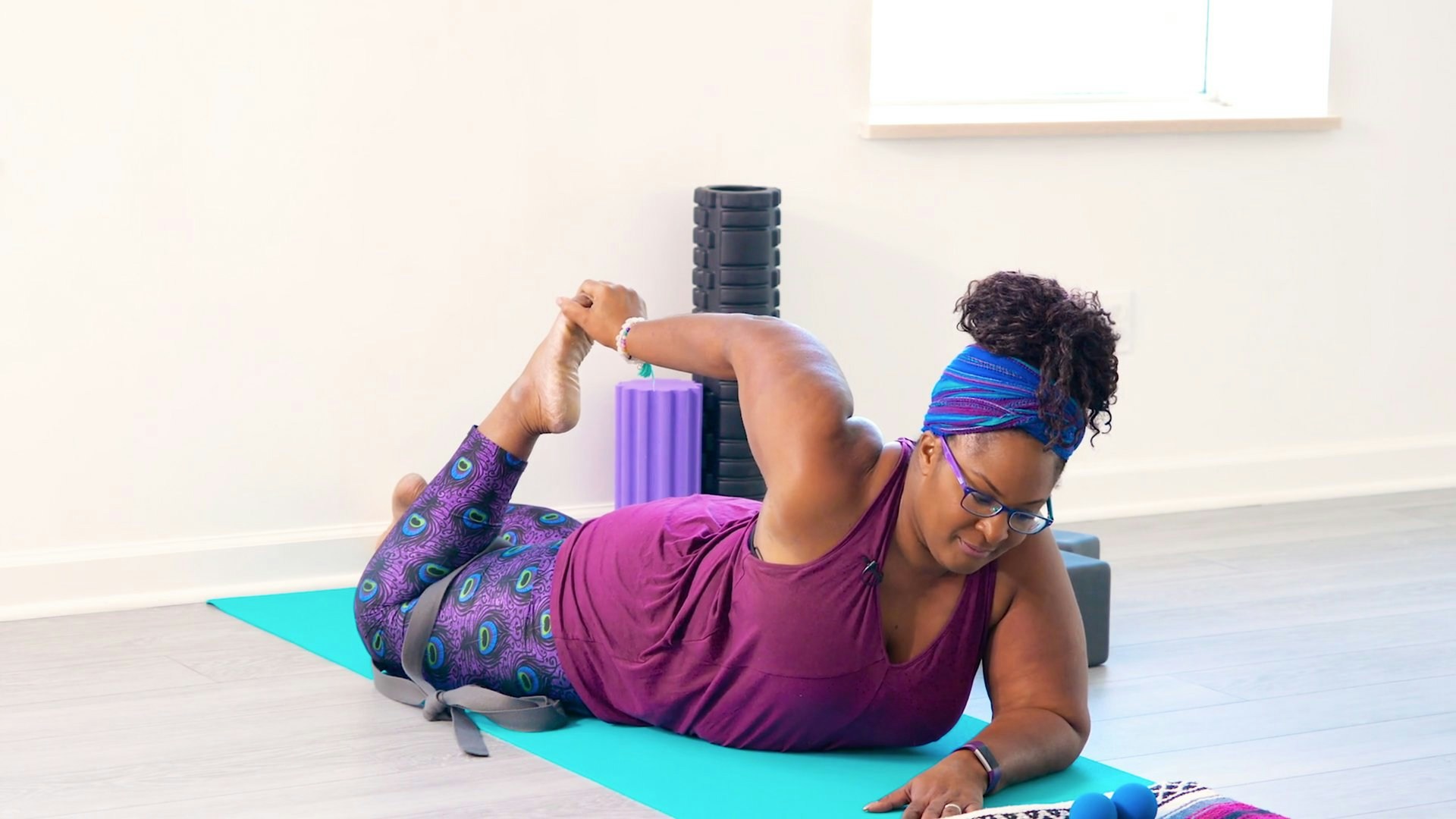 Props: foam roller, blanket, strap, squash ball, 2 blocks