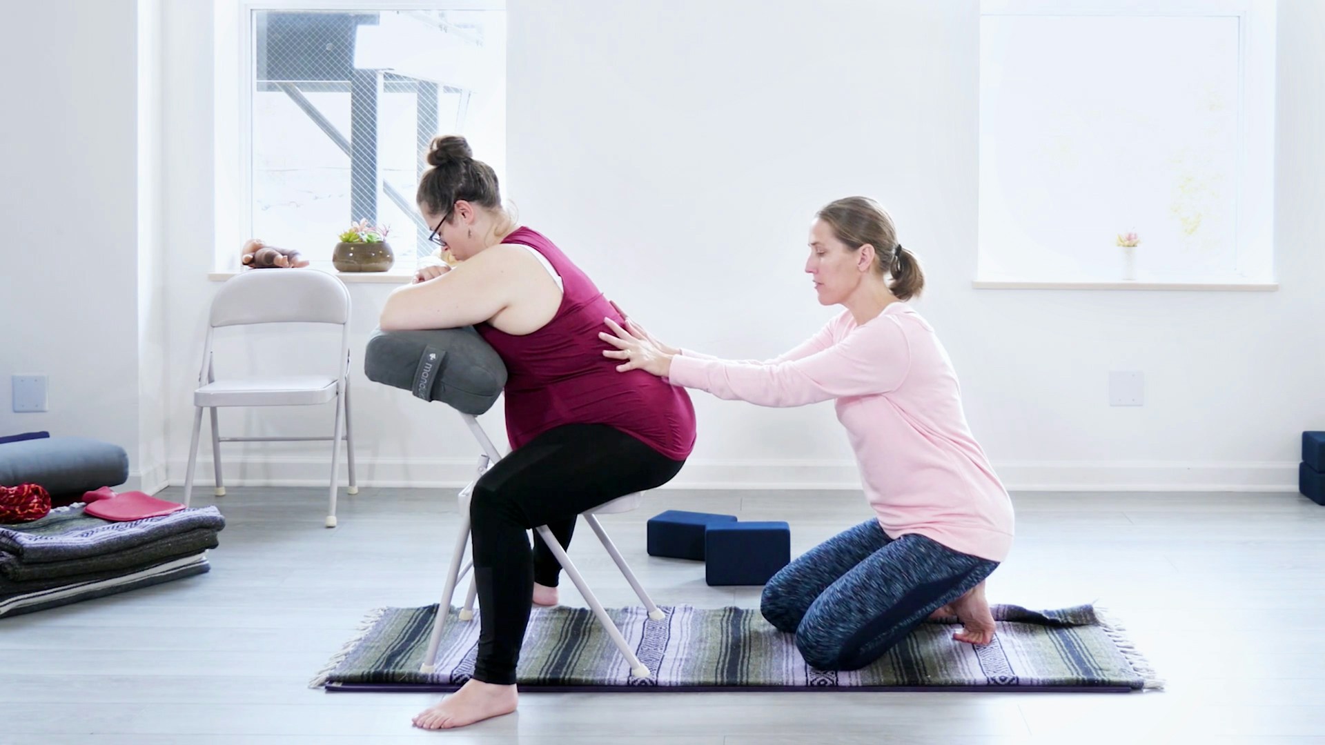 Props: wall, 2 chairs, 2 bolsters, blanket, 2 blocks, exercise ball