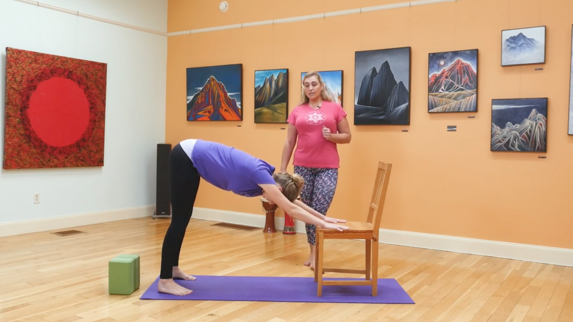 Seeking a gentle and accessible sequence without too much floor work? Practice gentle warm-ups, twists, a chair-supported warrior III (among other standing poses), chair dog, legs up the chair, and more.