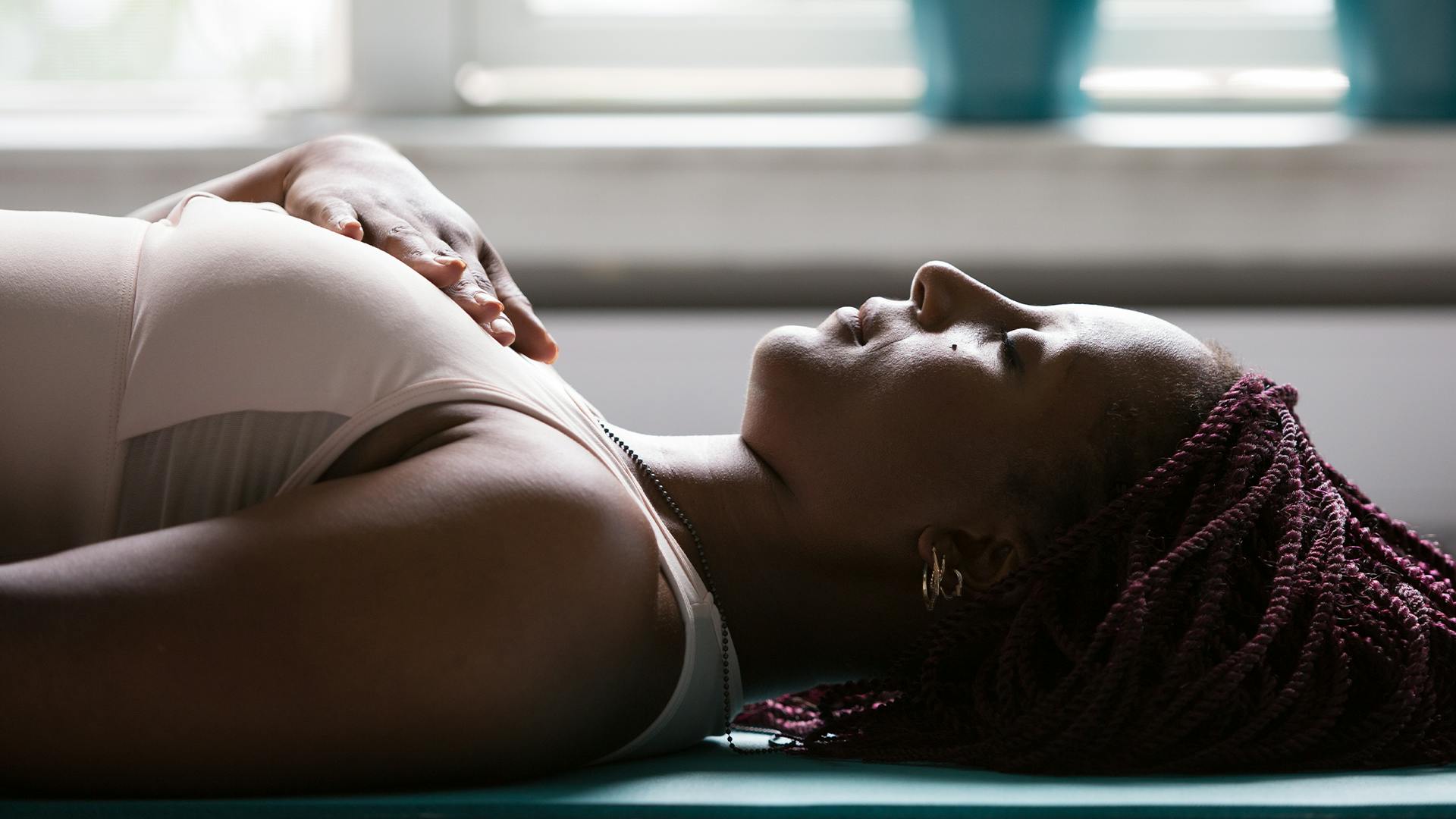 Instrucciones: Acuéstate boca arriba con la cabeza y el cuello apoyados en una almohada o cobija. Coloca las plantas de los pies juntas y abre suavemente las piernas alejándolas del cuerpo, permitiendo que las piernas descansen sobre almohadas o bloques. Toma de tres a cinco respiraciones profundas.