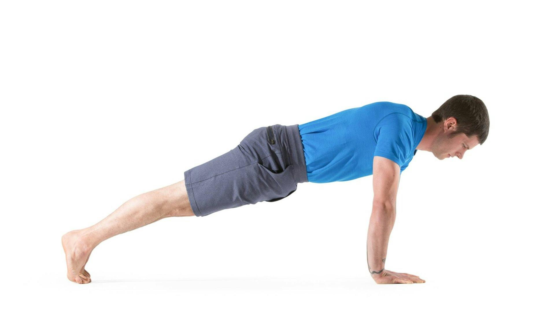 Partiendo desde la postura del perro boca abajo, desplaza tu cuerpo hacia adelante, luego alinea los hombros con las muñecas y los talones sobre la zona de los metatarsos.