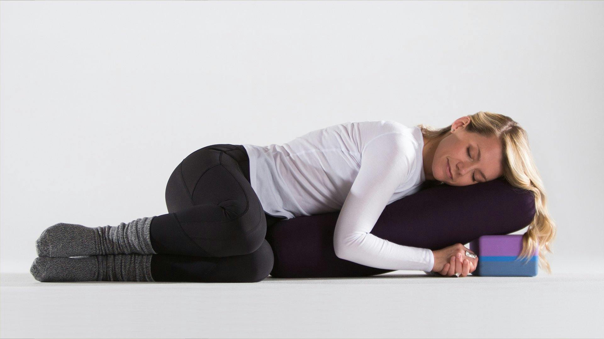 Nota: para mantener las piernas sobre el bolster sin esfuerzo, envuélvelas en una manta o coloca una banda de yoga alrededor de las pantorrillas o tobillos.