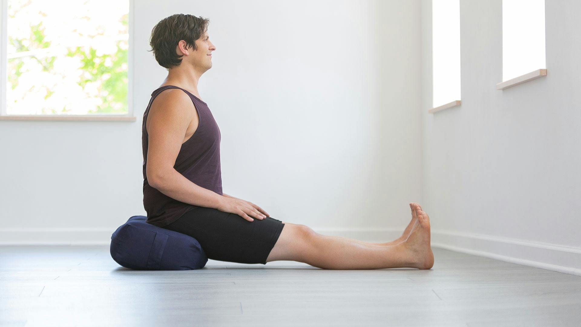 1. Siéntate derecho y estira las piernas. Presiona las palmas de las manos contra el piso (también puedes usar los puños o las yemas de los dedos) junto a las caderas y empuja hacia arriba con la coronilla. Curva la espalda baja hacia adentro levemente (si la espalda baja se redondea o si el estiramiento es muy intenso para ti, siéntate sobre unas mantas dobladas o un bolster y/o flexiona las rodillas; esto te permitirá curvar la espalda baja y hacer que el estiramiento resulte más tolerable). Cuando encuentres la posición en la que el estiramiento comienza a aparecer a lo largo de la zona posterior de las piernas, empuja los talones contra el piso para activar los isquiotibiales durante dos respiraciones.