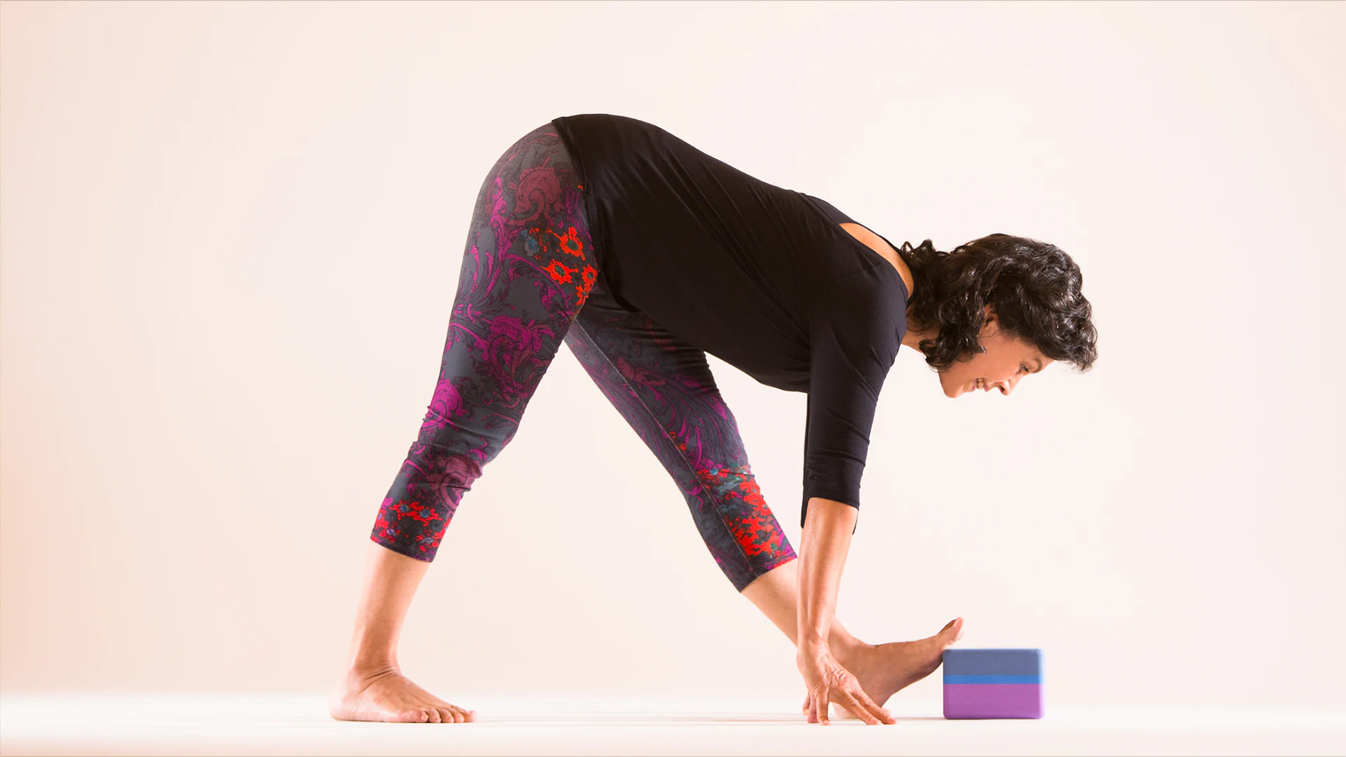 En posturas como la pirámide (parsvottanasana) y la del corredor (ardha hanumanasana), flexiona el pie delantero tirando de los dedos de los pies hacia la espinilla. Apoyar el metatarso del pie delantero sobre un bloque (manteniendo el talón en el suelo) puede ayudarte a intensificar el estiramiento porque produce resistencia a la flexión del pie.