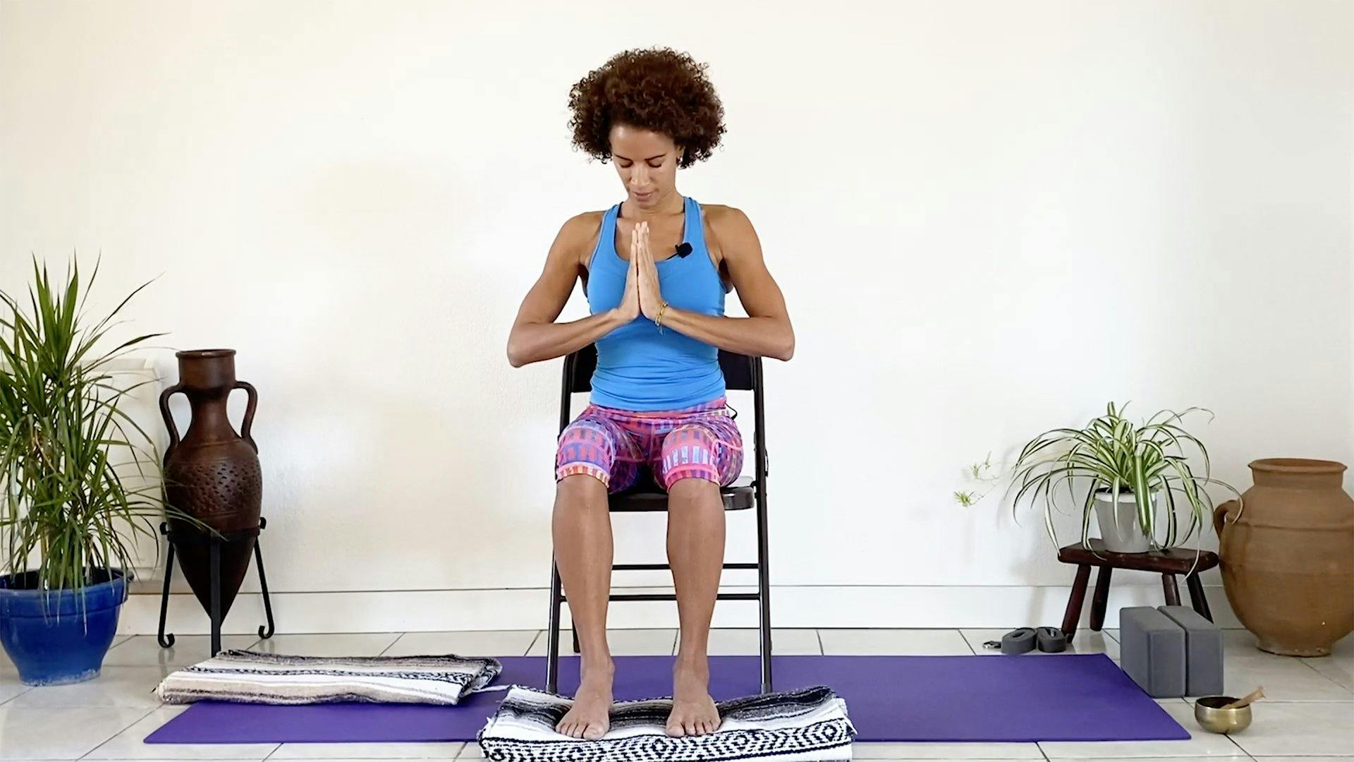 Explicaciones sobre el concepto de meditación y porqué es beneficiosa. Práctica de coordinación de la respiración con movimientos simples, seguido de una relajación y meditación guiada sentados en una silla.